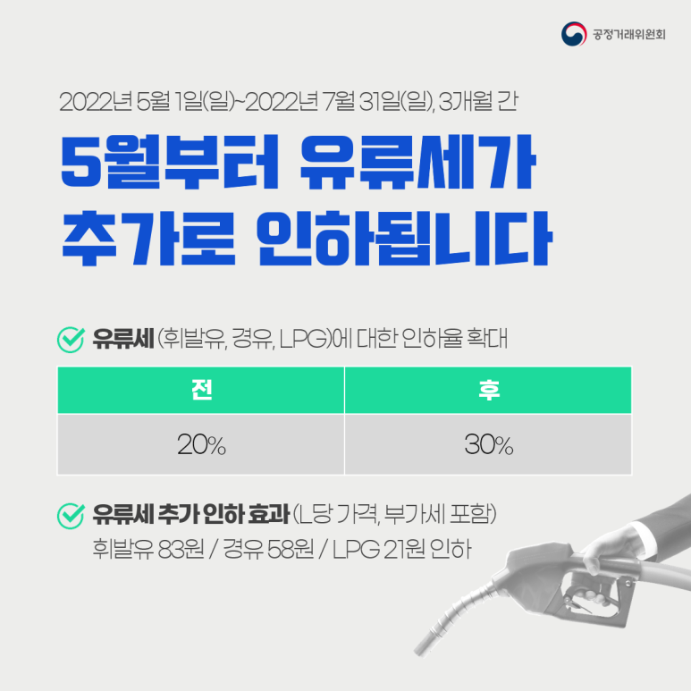정부는 4월 5일 정부세종청사에서 물가관계장관회의를 열고 "고유가로 어려움을 겪는 국민의 체감 유류비용을 낮추기 위해 고유가 부담 완화 3종 세트를 마련해 신속 시행할 것"이라고 밝혔다. 이를위해 유류세 인하 폭을 종전 20%에서 10%포인트를 추가한 30%로 확대해 5월부터 7월까지 3개월간 시행할 방침이다.