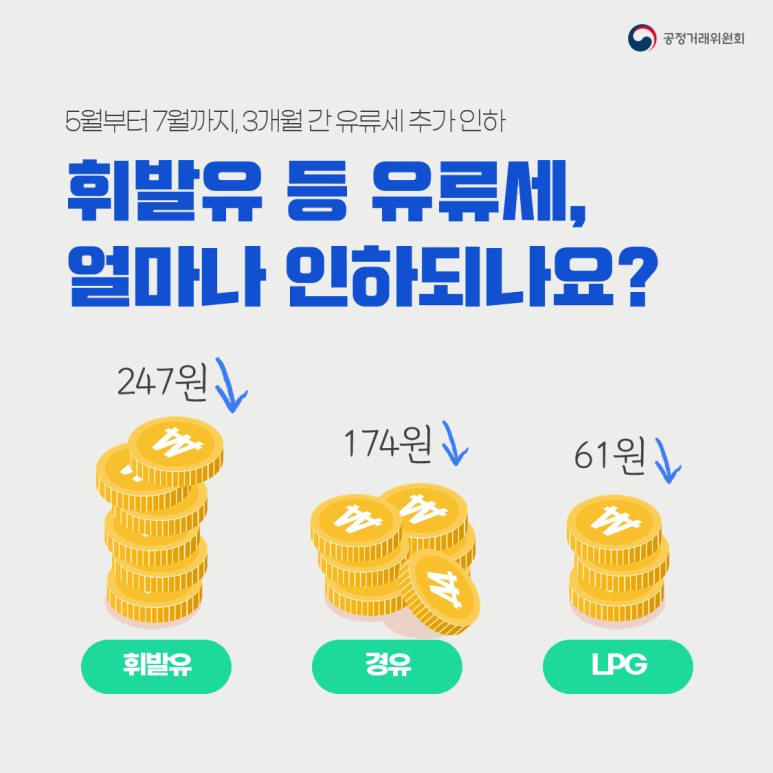 이번 유류세 인하로 리터(L) 당 10㎞의 연비로 하루 40㎞ 주행하는 운전자는 휘발유 기준 월 3만원의 유류비를 절감할 수 있다. 유류세 20% 인하 때와 비교하면 유류비 부담이 1만원 줄어든다. 경유 가격 급등으로 어려움을 겪는 대중교통·물류 업계의 부담 경감을 위해서는 영업용 화물차, 버스, 연안 화물선 등에 대해 경유 유가연동 보조금을 3개월간 한시적으로 지급하기로 했다.