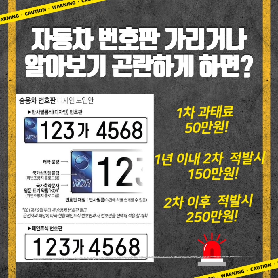 현행 '자동차관리법'은 등록번호판을 가리는 행위 혹은 알아보기 곤란하게 하거나 그런 자동차를 운행한 경우, 1차 과태료 50만 원을 부과합니다. 또한 1년 이내에 2차 적발 시 150만 원, 2차 이후 적발되면 250만 원의 과태료가 부과돼 주의가 필요합니다. 상습적 법규 위반자는 과태료 등의 행정처분이 아닌 형사처분을 받아 1년 이하의 징역 또는 1,000만 원 이하의 벌금에 처할 수 있습니다.