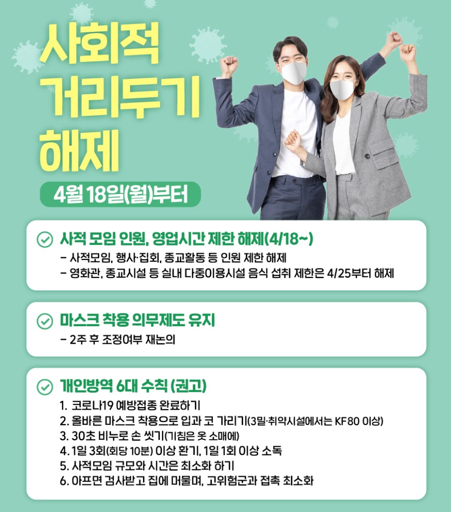 이번 거리두기 해제로 소중한 일상 회복을 기대하게 되었다. 그렇다고 코로나19가 완전히 종식된 것은 아니다. 마스크 착용은 해제되지 않아 야외에서는 마스크 착용이 필수다. 개인 감염 차단을 위해 방역수칙 준수는 필수다. 그것이 코로나19 종식을 앞당기는 길이다.
