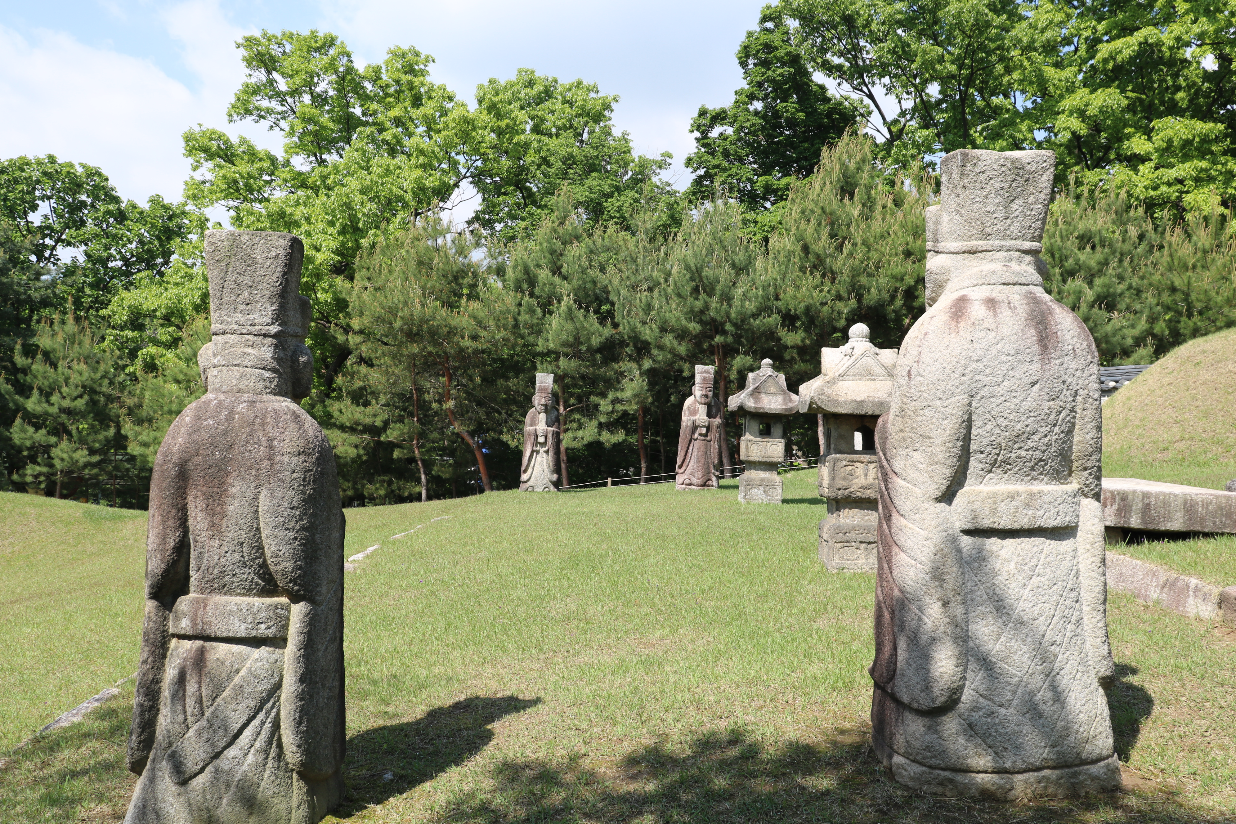연산군 부부의 묘 앞에는 죄우 2기씩, 4기의 문인석이 세워져 있습니다. 문인석(文人石)은 능(陵) 앞에 세우는, 문관의 형상으로 깎아 만든 석상입니다. 도포를 입고 머리에는 복두(幞頭)나 금관을 쓰며 손에는 홀(笏)을 든 공복(公服) 차림을 하고 있습니다. 고려 때는 문인석, 무인석이 있었는데요, 조선 시대에는 능 앞에 문인석만을 세웠다고 합니다.