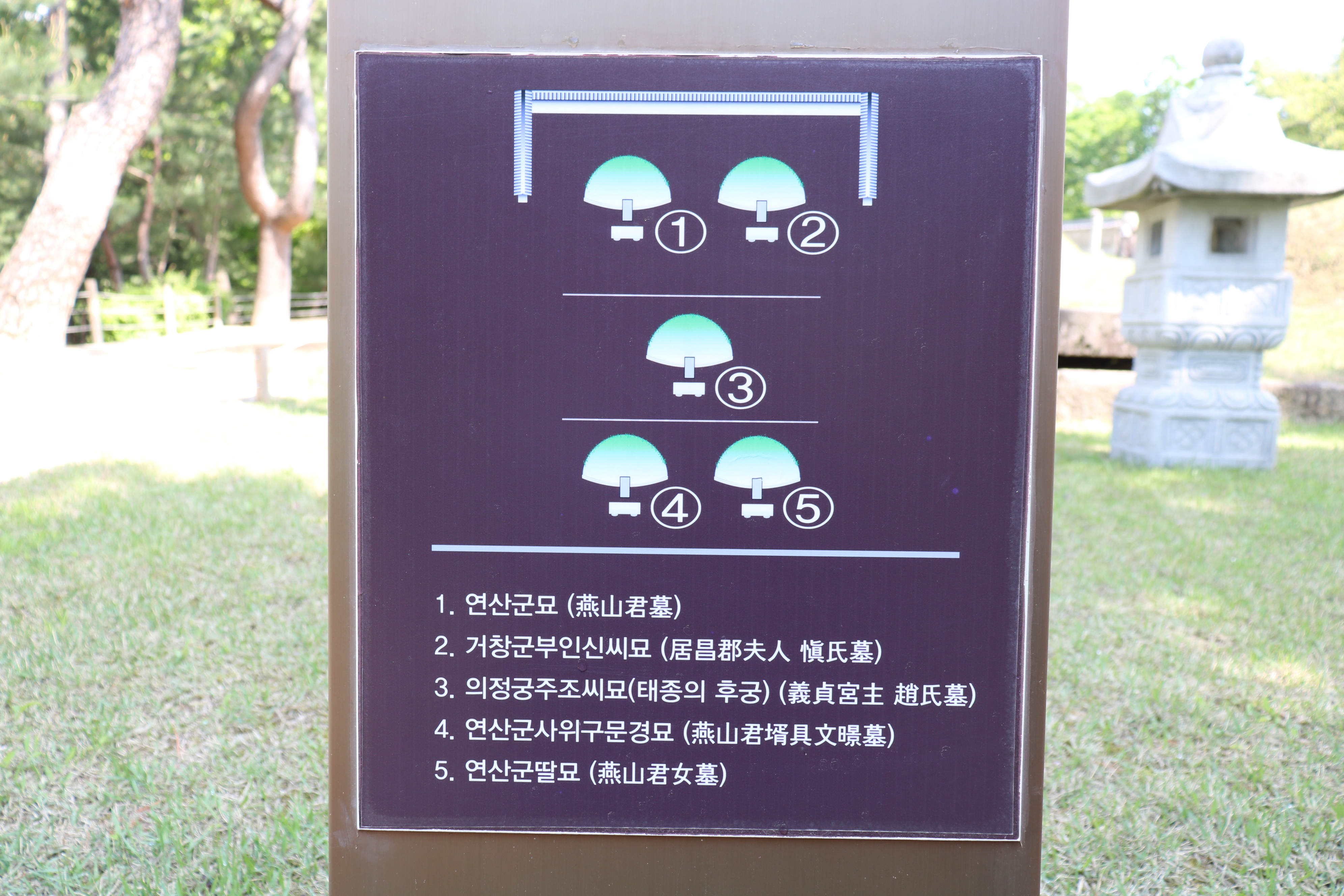 연산군 묘역 상설도를 보니 다섯 기의 묘가 3단에 걸쳐 자리잡고 있습니다. 제일 안쪽 상단에 연산군과 부인 신씨 묘가 나란히 있고, 그 앞쪽 중단에는 의정궁주 조씨의 묘가 있으며, 제일 앞 하단에는 연산군의 딸과 사위 구문경의 묘가 나란히 있습니다.