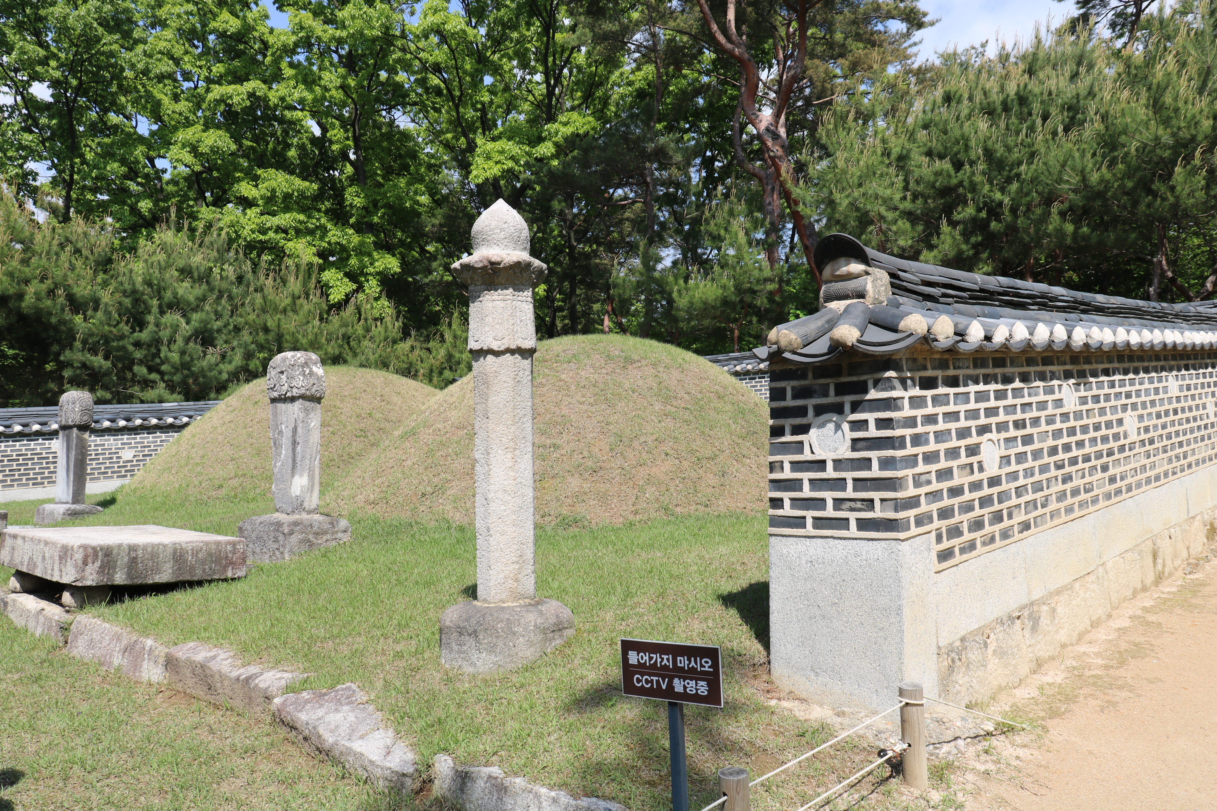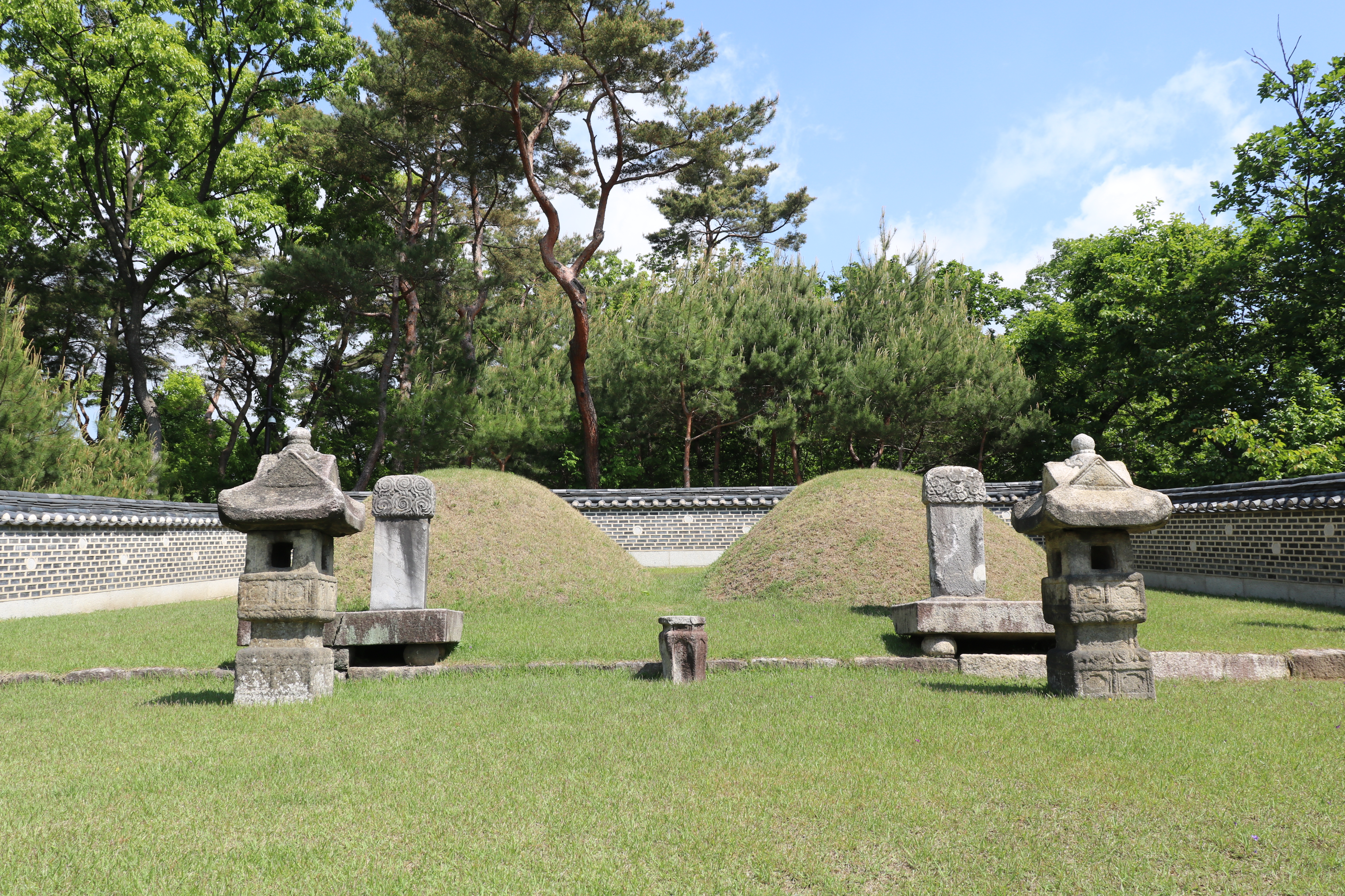 묘역 상단에 있는 연산군 부부의 묘소입니다. 왼쪽이 연산군, 오른쪽이 부인 신씨의 묘소입니다. 그냥 보통의 무덤과 별반 다를 바 없어 보입니다. 왕릉에서 보이는 병풍석(屛風石), 석마(石馬), 석양(石羊) 둥은 없습니다. 묘지 뒤에 곡장(曲牆 : 무덤 뒤에 둘러친 담장)이 있어서 그나마 썰렁한 느낌을 지울 수 있네요.