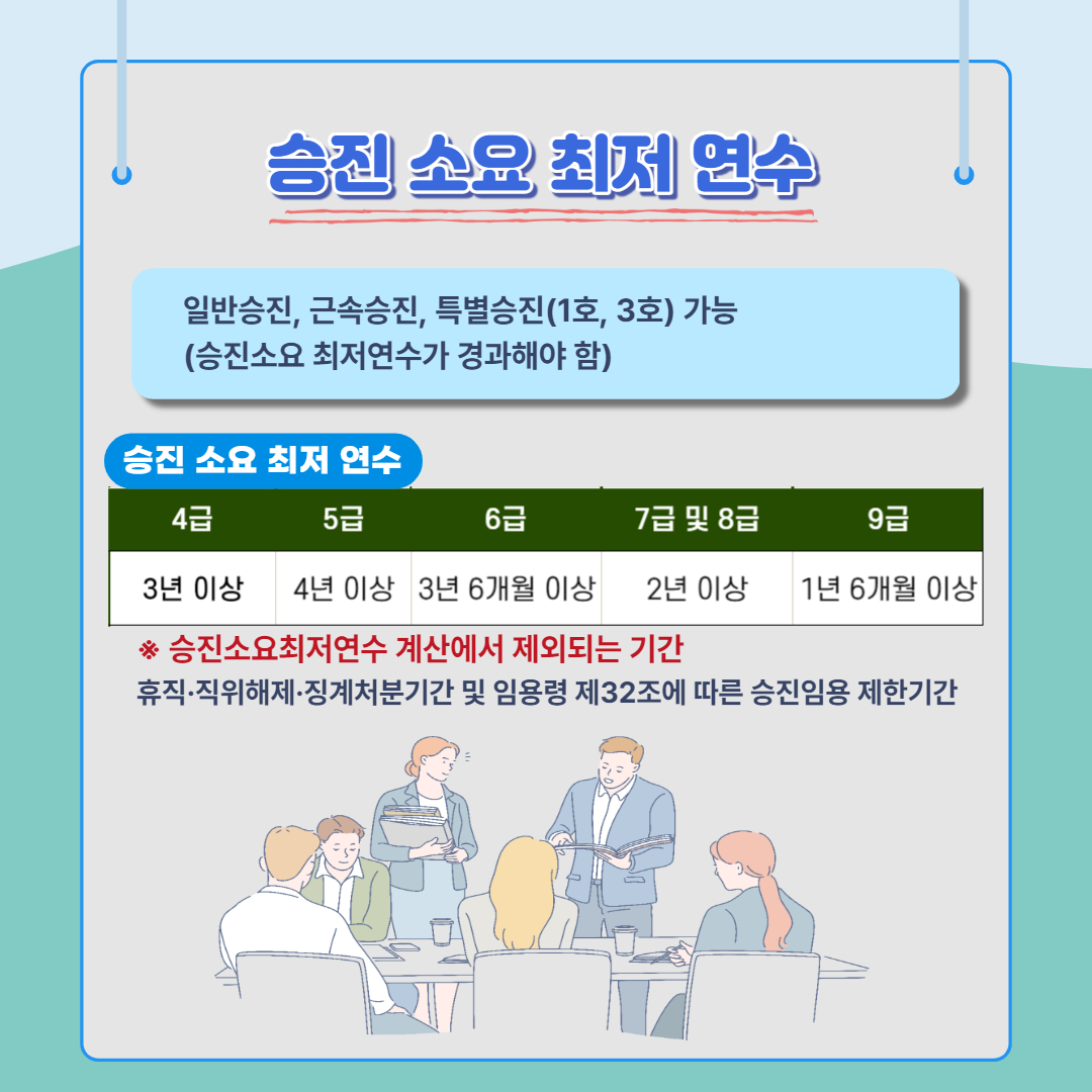 공무원은 승진소요 최저연수가 경과해야 일반승진, 근속승진, 특별승진(1호, 3호)이 가능합니다. 승진 소요 최저 연수는 4급은 3년 이상, 5급은 4년 이상, 6급은 3년 6개월 이상, 7급 및 8급은 2년 이상, 9급은 1년 6개월 이상입니다. 단, 승진소요 최저연수 계산에서 제외되는 기간이 있는데요, 휴직·직위해제·징계처분 기간 및 임용령 제32조에 따른 승진임용 제한 기간입니다.