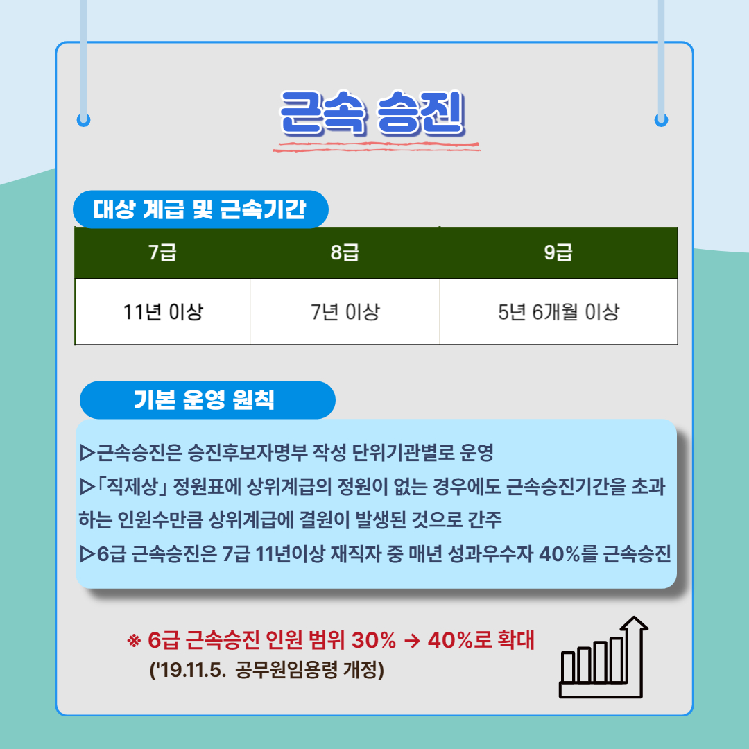 근속승진의 기본 운영원칙은 ▷ 승진후보자명부 작성 단위기관별로 운영하고 ▷「직제상」 정원표에 상위 계급의 정원이 없는 경우에도 근속승진기간을 초과하는 인원수만큼 상위 계급에 결원이 발생된 것으로 간주합니다. 6급 근속승진은 7급 11년 이상 재직자 중 매년 성과우수자 40%를 근속승진 시키고 있습니다.