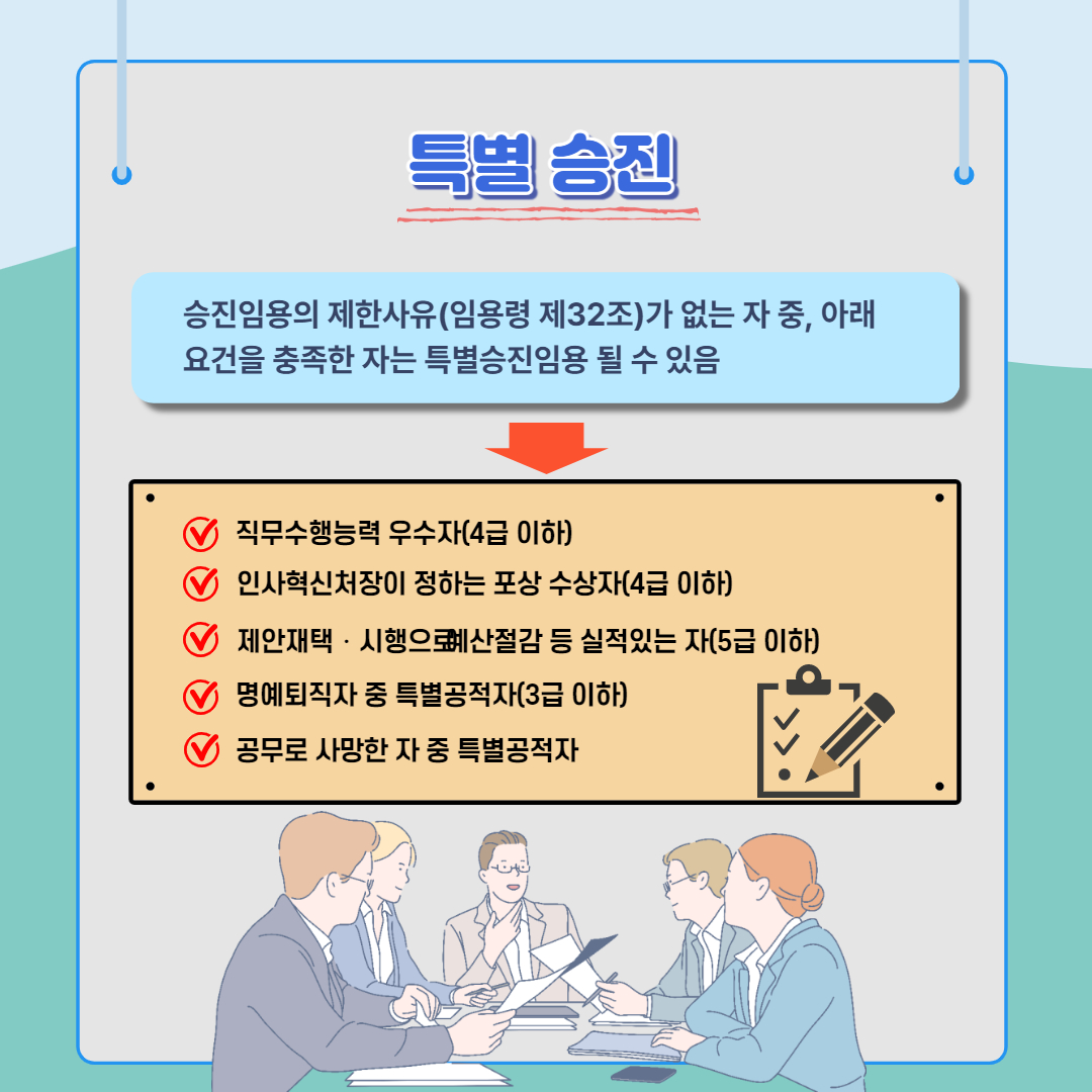 ‘공무원은 시간만 가면 승진한다’는 말은 이제 <전설따라 삼천리>에나 나오는 말입니다. 열심히 일한 공무원은 공정하고 투명한 승진심사로 승진소요 최저연수에 도달하면 승진할 확률이 높습니다. 더 빨리 승진하고 싶다면 적극행정을 펼쳐 특별승진을 하면 되겠죠. 꼭 승진이 아니더라도 모든 공무원이 국민편의를 위해 적극적으로 일해주길 기대합니다.