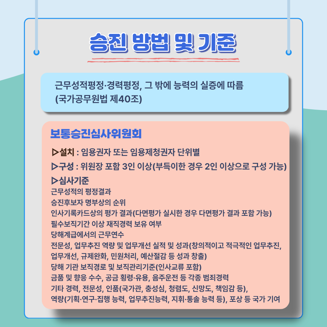 승진 방법 및 기준은 국가공무원법 제40조에 따릅니다. 근무성적평정·경력평정, 그 밖에 능력의 실증에 따라 승진 여부가 결정됩니다. 심사는 보통심사위원회에서 하는데요, 임용권자 또는 임용제청권자 단위별로 설치합니다. 위원장 포함 3인 이상(부득이한 경우 2인 이상으로 구성 가능)으로 구성합니다.