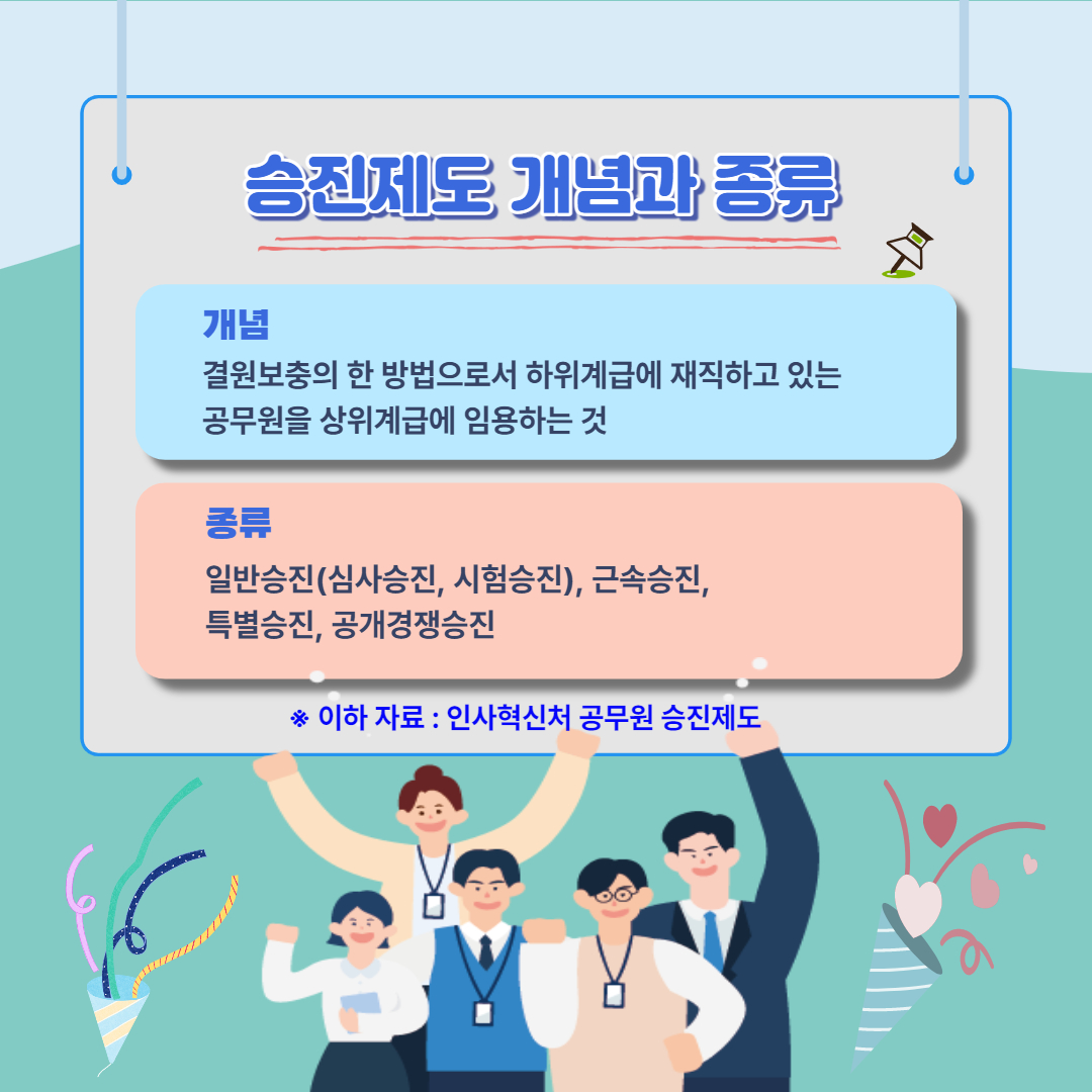 일반 기업이든, 공무원이든 샐러리맨들의 가장 큰 기쁨은 뭘까요? 연봉이라고요? 물론 연봉을 많이 받으면 좋겠지만요, 뭐니 뭐니 해도 승진이 아닐까 싶습니다. 공무원은 시간만 지나면 자동으로 승진한다고 생각하시는 분이 있는데요, 이는 옛말입니다. 적극행정 등 근무성적이 좋아야 승진하죠. 오늘은 공무원 승진제도에 대해 알아보겠습니다.