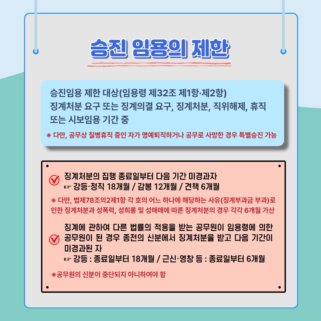 승진임용 제한 대상(임용령 제32조 제1항·제2항)은 징계처분 요구 또는 징계의결 요구, 징계처분, 직위해제, 휴직 또는 시보임용 기간 중에 해당됩니다. 다만, 공무상 질병휴직 중인 자가 명예퇴직하거나 공무로 사망한 경우 특별승진 가능합니다.