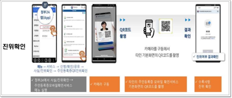 스마트폰에 표출된 주민등록증 정보는 정부24 앱의 ‘사실/진위확인’ 메뉴에서 주민등록증 모바일 확인서비스의 QR을 촬영하거나 검증 에이피아이를 이용해 진위여부를 확인할 수 있다.