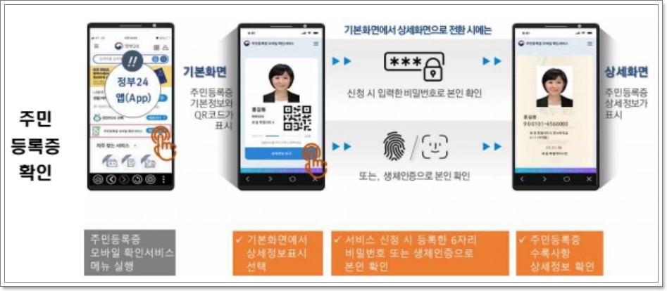 이 서비스는 실물 주민등록증 없이도 성명, 사진, 주민등록번호, 주소, 발행일, 주민등록기관 등 주민등록증에 수록된 사항을 스마트폰 화면에 표출해주고 이의 진위를 확인해 신분확인이 가능하다. 특히 '주민등록증 모바일 확인서비스'는 개정된 주민등록법에 따라 신분을 확인한 경우 실물 주민등록증을 확인한 것과 동일한 효력을 갖는다.