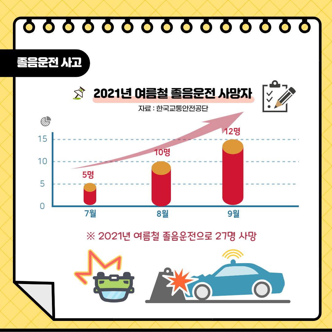 졸음운전으로 인한 사망자가 70%가 넘는다는 사실 알고 계신 가요? 지난해 여름을 보니 7월은 5명, 8월은 10명, 9월은 12명으로 총 27명이 사망했습니다. (자료 : 한국교통안전공단) 잠깐의 졸음이 큰 사고를 불러일으킬 수 있습니다.