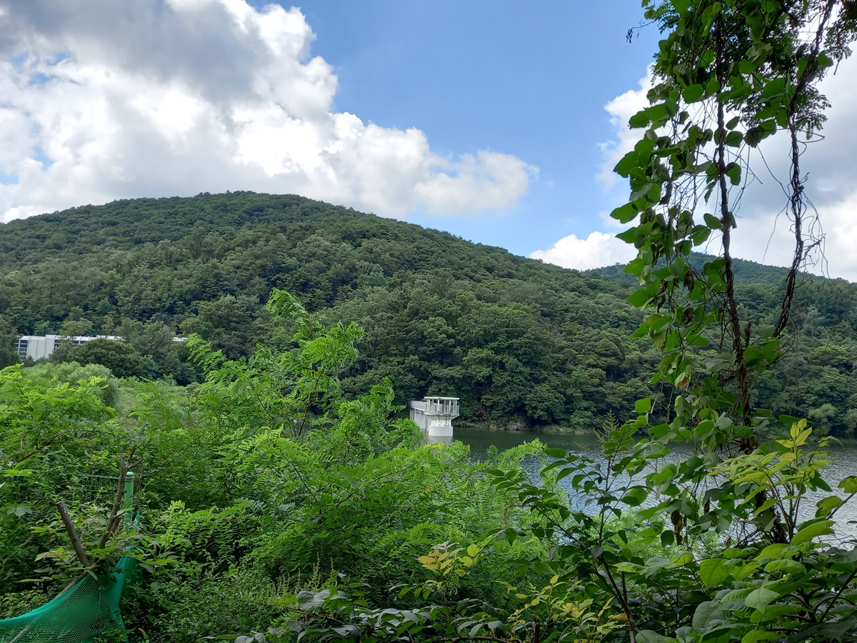 나무 사이로 보이는 저수지와