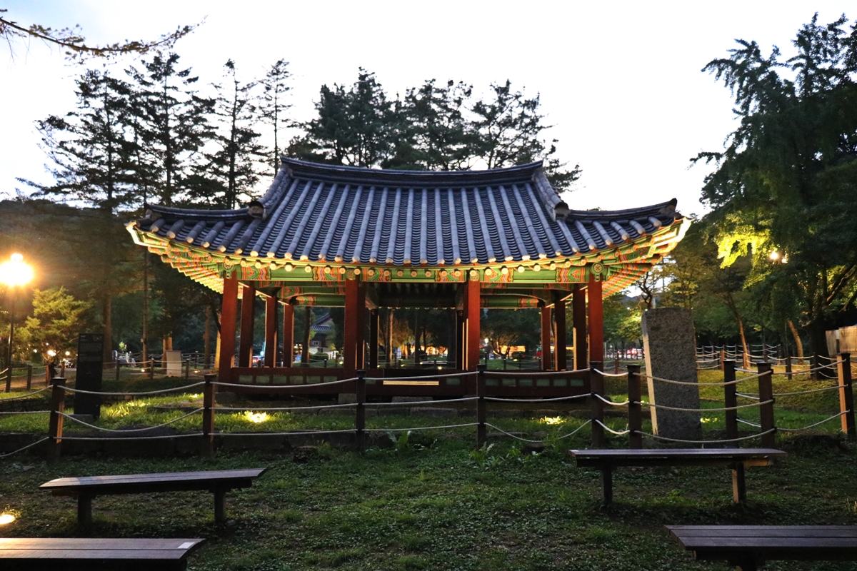 지수당 앞에 안내문이 있습니다. 읽어보니, 조선 시대(1672년)에 이세화가 세웠다고 합니다. 건립 당시에는 건물 앞뒤로 3개의 연못이 있었는데요, 지수당이 있던 연못은 매몰되고 현재 2개의 연못만 남아 있습니다. 지수당에 조명이 없었는데요, 이렇게 조명을 비추니 너무 아름답네요. 호수에 지수당이 그대로 비춰 더 환상적입니다.