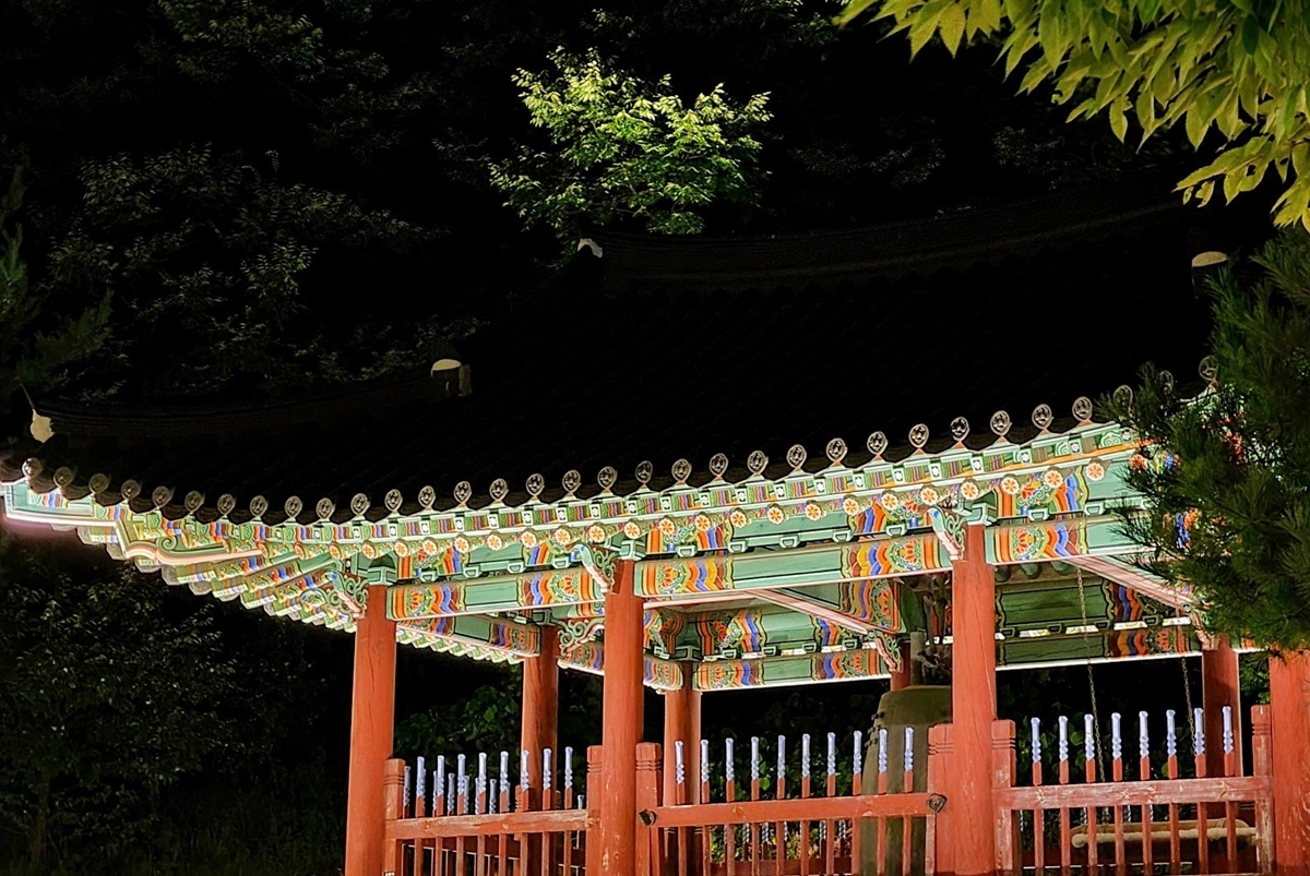 이제 남한산성 행궁 쪽으로 가보겠습니다. 한옥 건물이 화려하죠? 남한산성 행궁 올라가기 전에 있는 천흥사 동종입니다. 여기도 조명이 화려하네요. 천흥사 동종은 고려 헌종 1년(1010년)에 세워졌다니 천년이 넘은 종입니다. 원래는 태조 4년(921)에 태조가 세운 충남 천안의 천흥사에 있었다고 하는데요, 남한산성으로 옮겨와 조선 시대 남한산성에서 시간을 알려주는 역할을 했다고 합니다.
