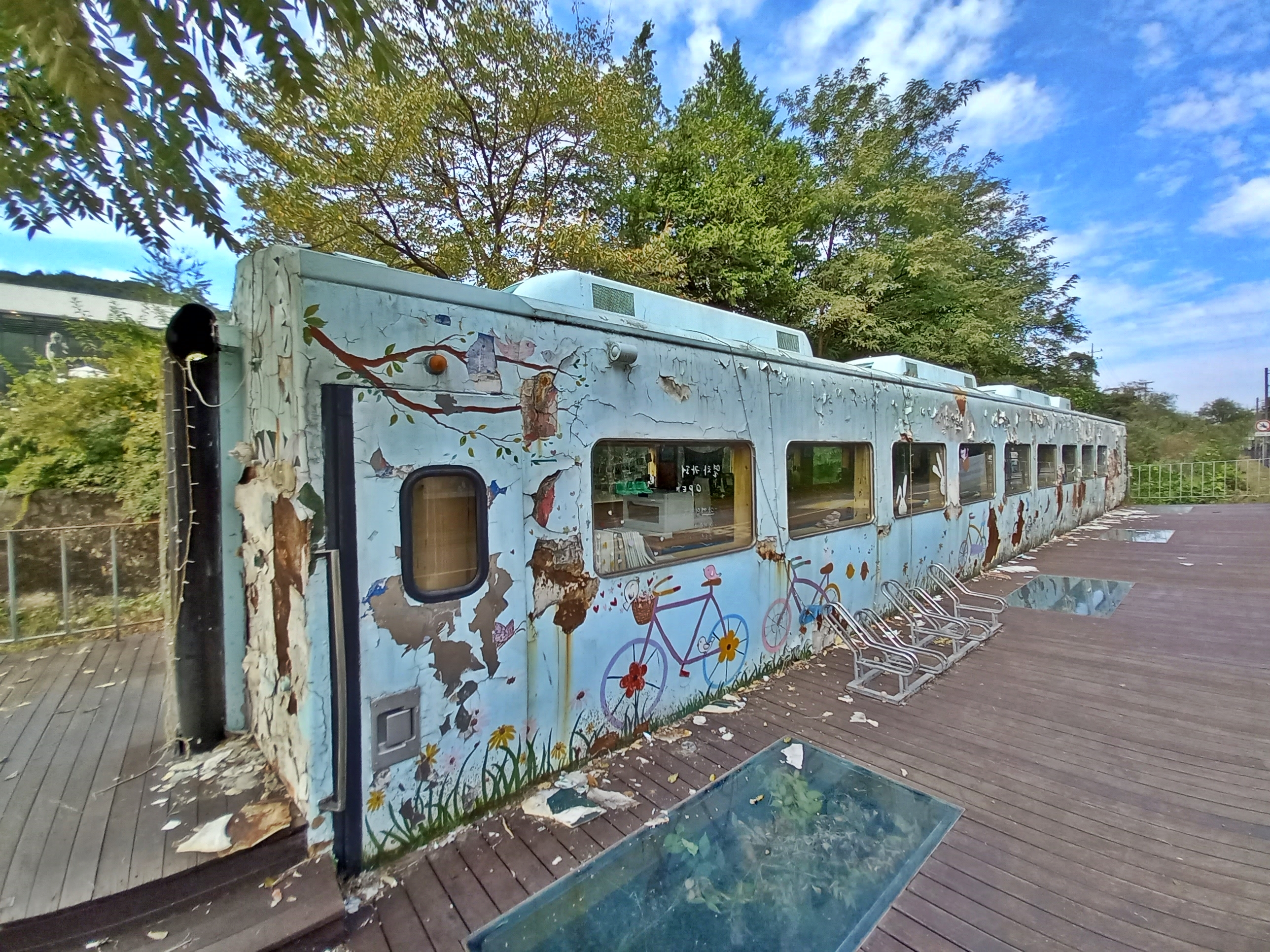 능내역을 다니던 무궁화호 열차는 이제 열차 카페가 되었습니다. 낡고 녹슨 모습이지만, 한번 올라타 보고 싶습니다. 문이 잠겨서 탈 수 없었지만요, 열차 안을 들여다보니 차를 마실 수 있는 공간으로 바꾸었네요. 창문에 낡고 빛바랜 열차 여행 사진이 걸려 있습니다.
