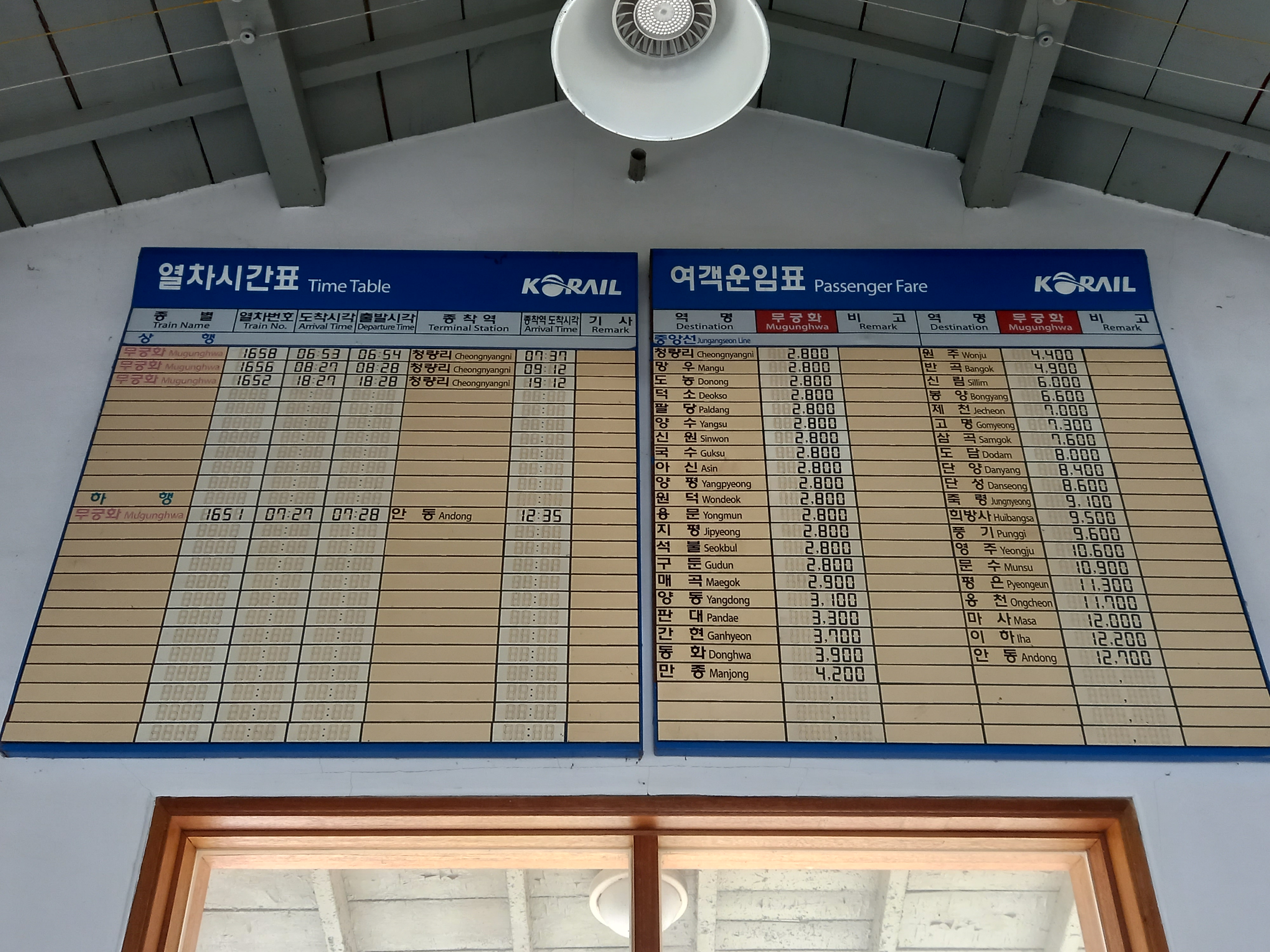 열차 시간표와 여객 운임표가 맞이방 벽에 붙어 있습니다. 청량리에서 망우, 도봉, 팔당, 양평은 물론 원주, 단양, 풍기, 영주, 안동까지 있습니다. 언제적 운임표인지 모르지만(2008년 폐쇄 당시 가격 예상), 능내역에서 안동까지 가는 무궁화호 운임이 12,700원입니다.