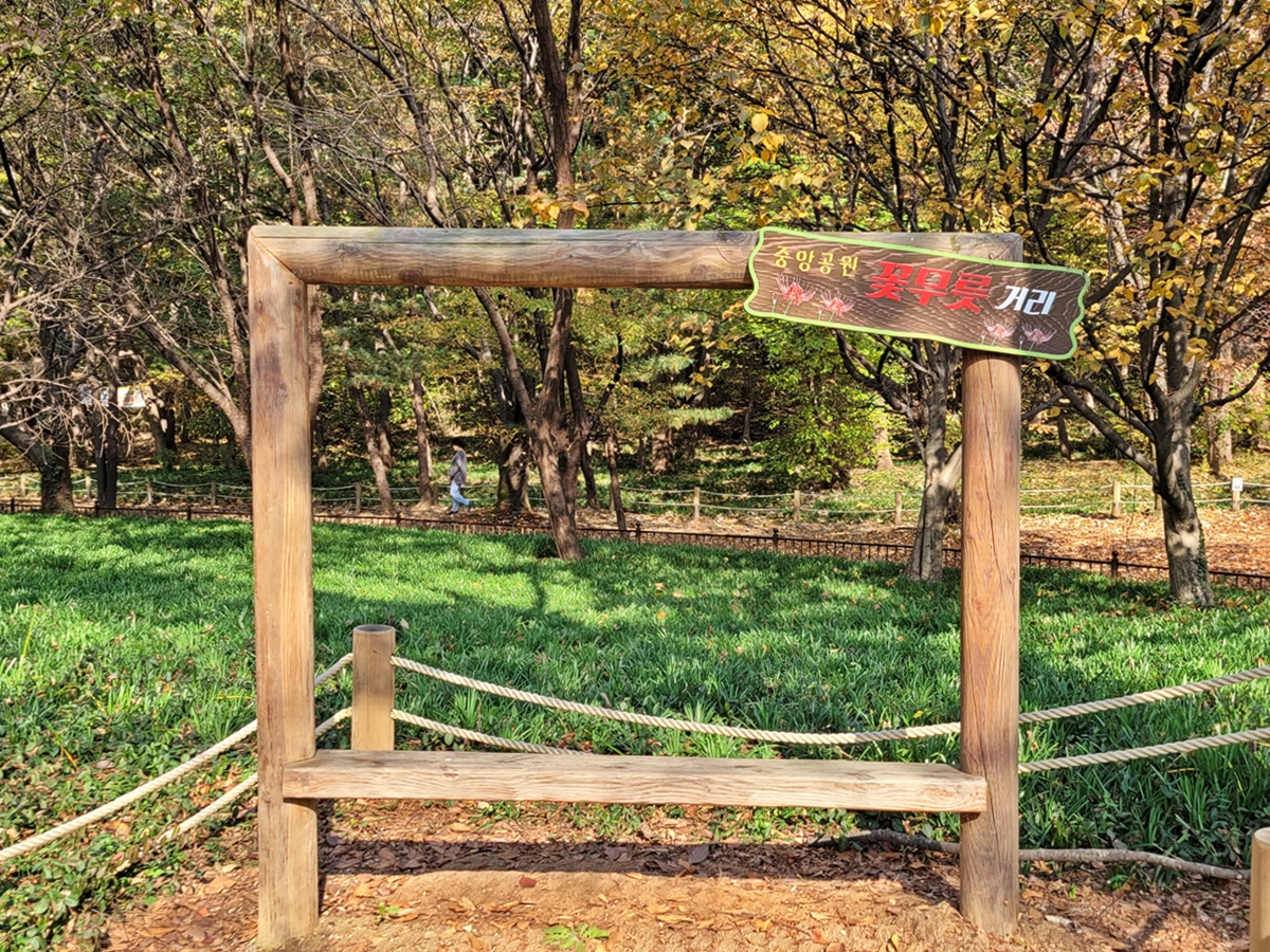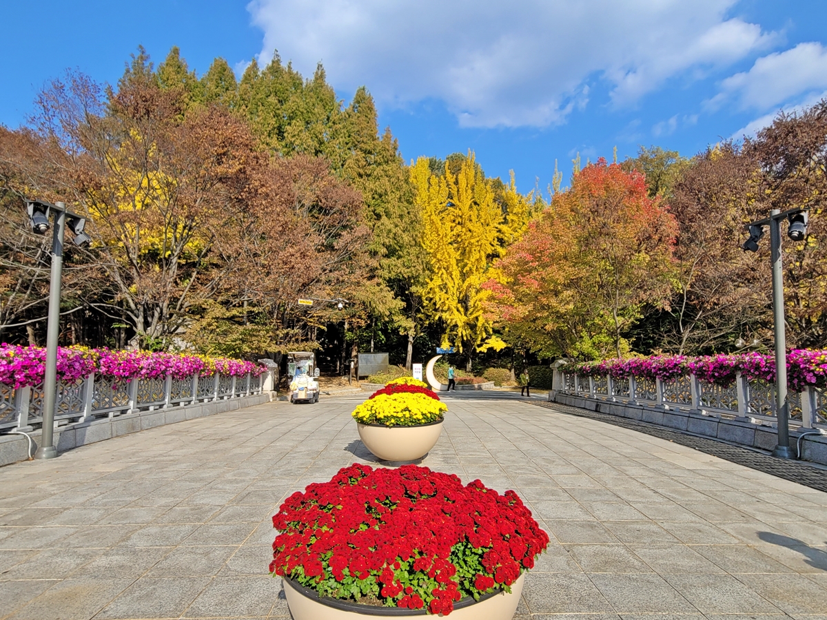 공원으로 들어서는 순간 은행나무, 단풍나무가 어우러져 와우~ 하는 탄성이 절로 나옵니다. 공원으로 들어서는 다리에도 국화 등 가을꽃으로 장식해놨습니다.