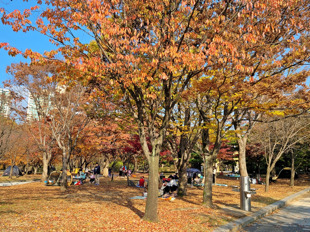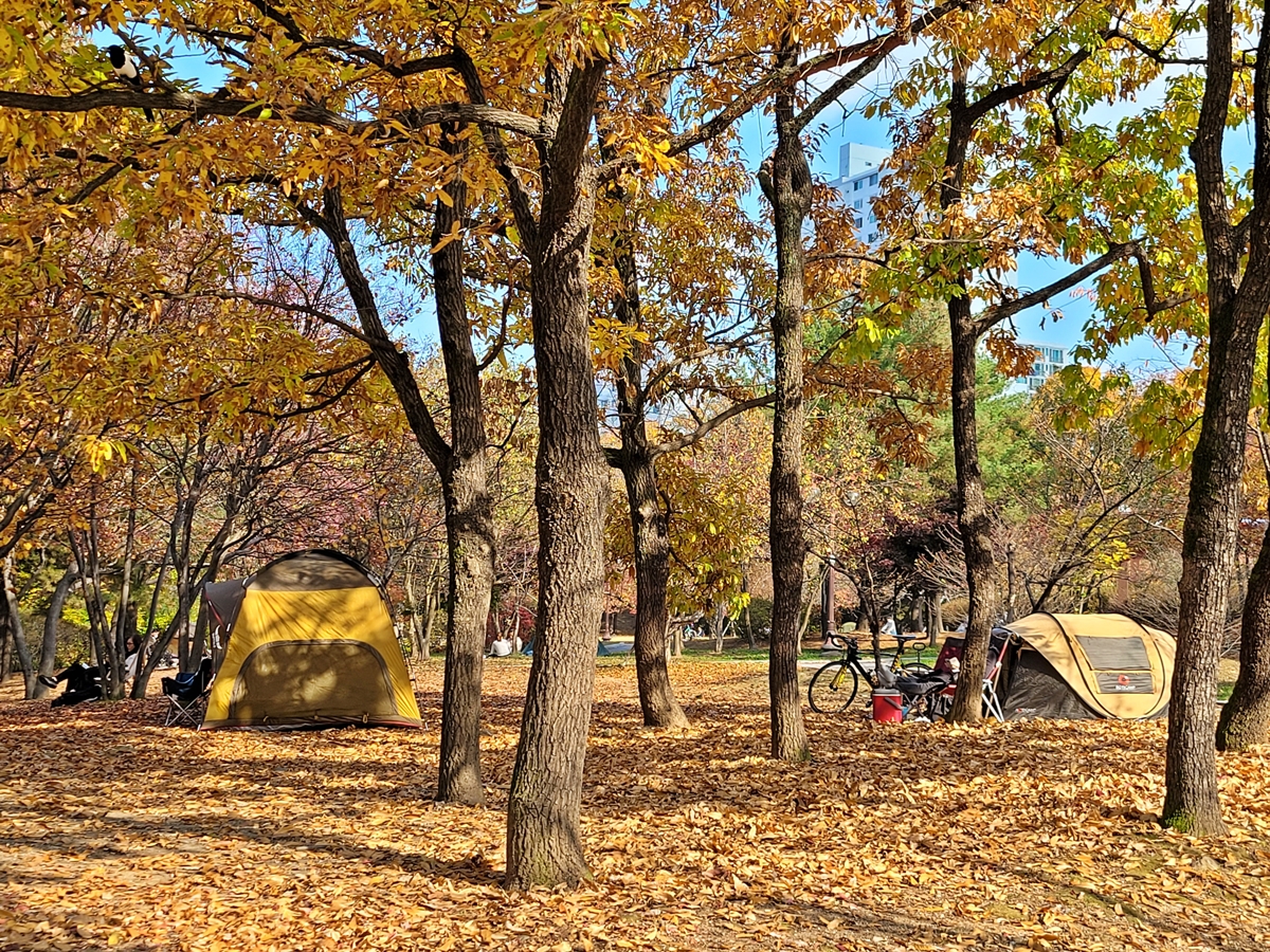 떠나는 가을이 아쉬운가요. 가족 단위로 나무 아래 타프 치고 쉬는 시민이 많습니다. 분당중앙공원은 여름이면 더위를 식히러 오는 사람이 많죠. 도심 속에서 이렇게 나무가 많은 곳이니 멀리 캠핑장 갈 필요가 없죠.