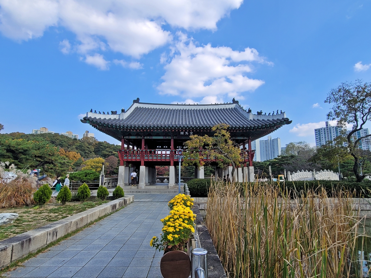 돌마각(突馬閣)은 2층 누각 형태입니다. 경복궁 경회루를 본떠서 만든 것입니다. 돌마각 2층에 올라가 보면 공원경관을 한눈에 조망할 수 있습니다. 가을 하늘과 뭉게구름, 돌마각이 조화를 이뤄 멋진 풍광을 보여주고 있습니다.