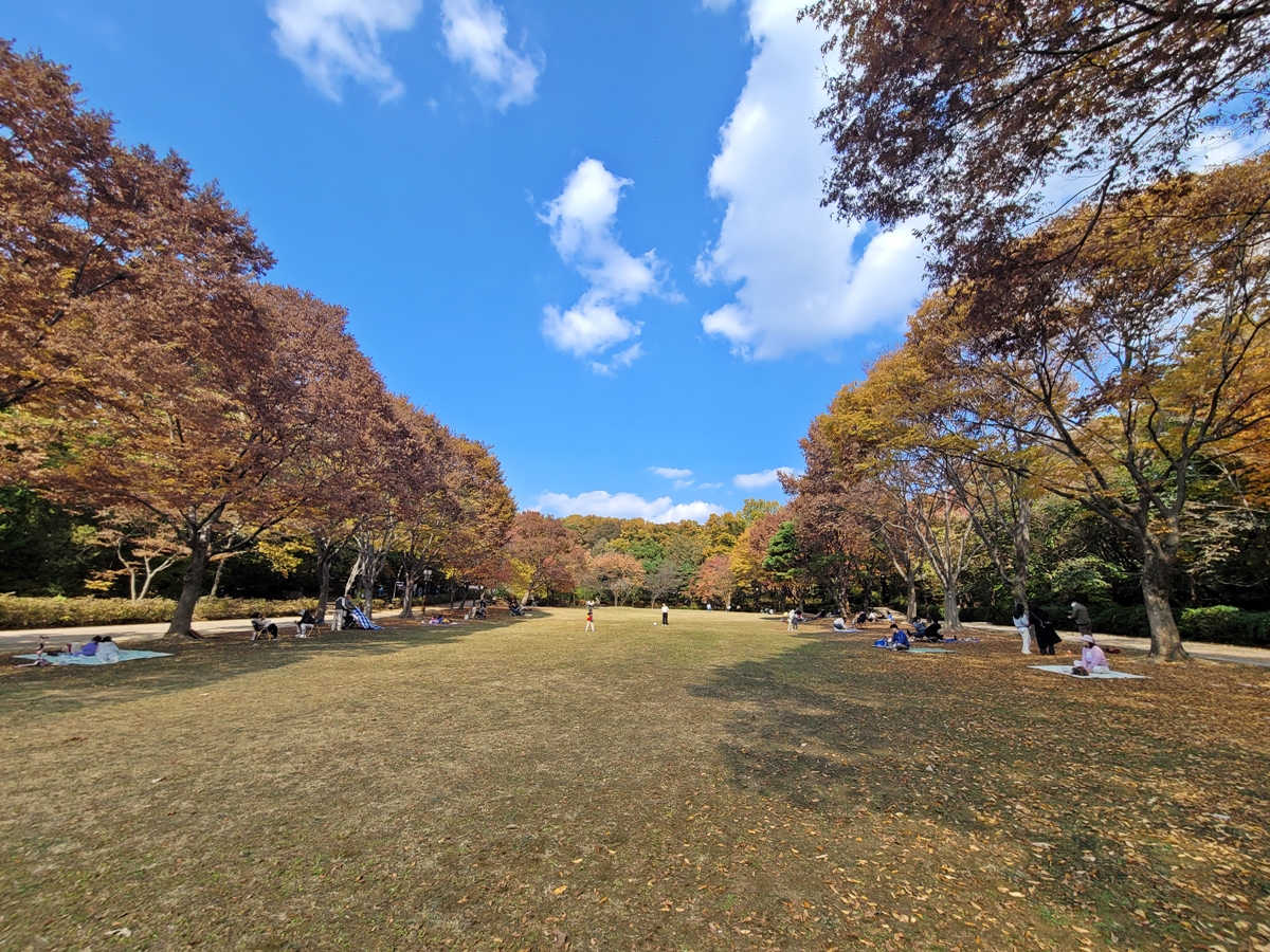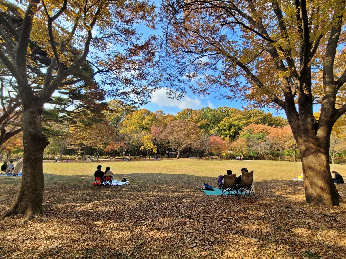 이곳은 잔디광장입니다. 여름에는 그늘이 되어주던 나무들이 이제 갈색으로 변했습니다. 많은 사람이 나무 아래 돗자리를 깔고 가을 하늘을 지붕 삼아 쉬고 있습니다. 캠핑 의자 하나만 있으면 이곳이 심심산골 캠핑장 못지않습니다.