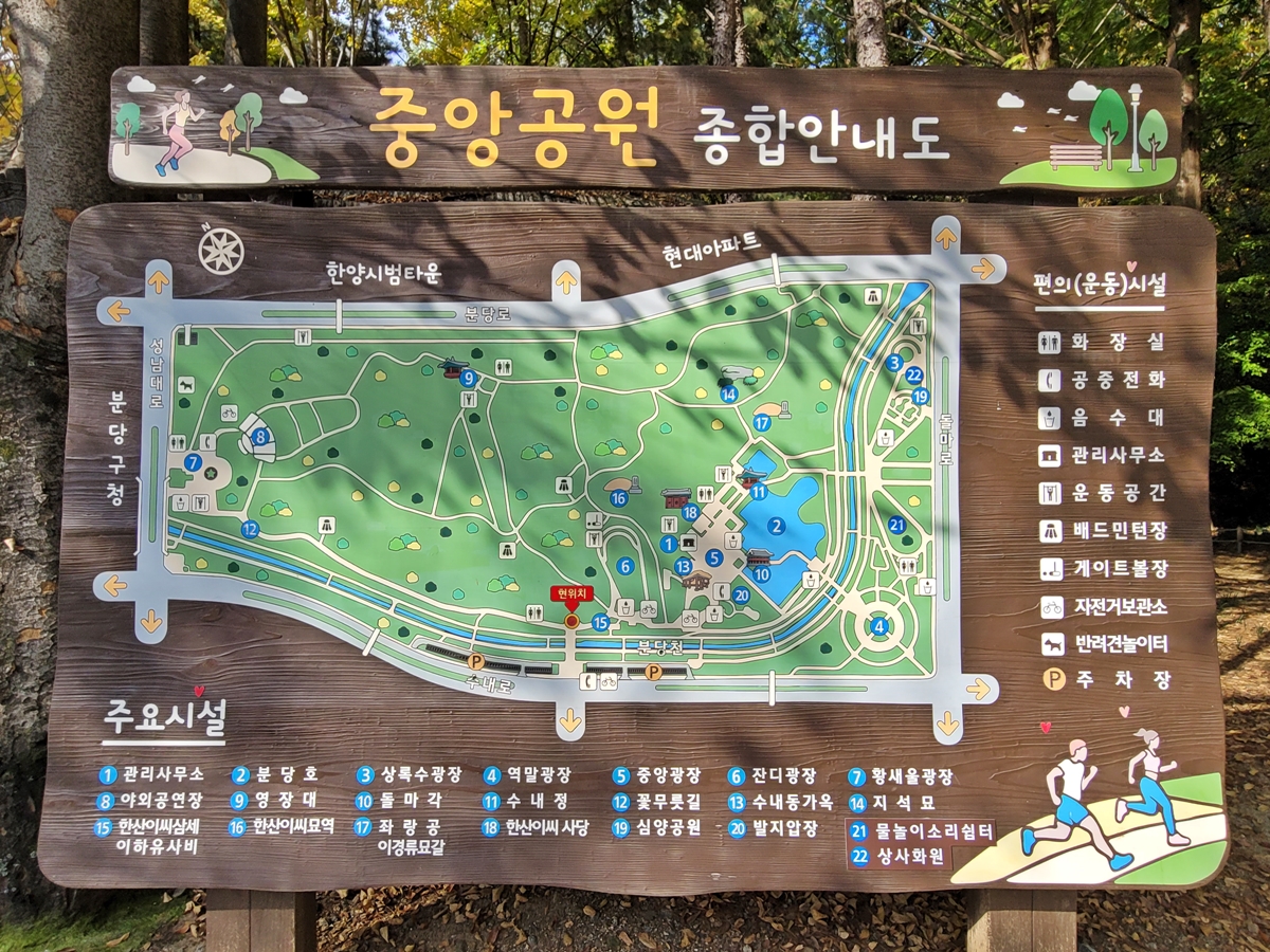 분당중앙공원은 굉장히 넓습니다. 여기서 다 소개하긴 어렵고 주요 명소 위주로 설명하겠습니다. 공원 곳곳에 종합안내도가 있어 참조하면 좋습니다.