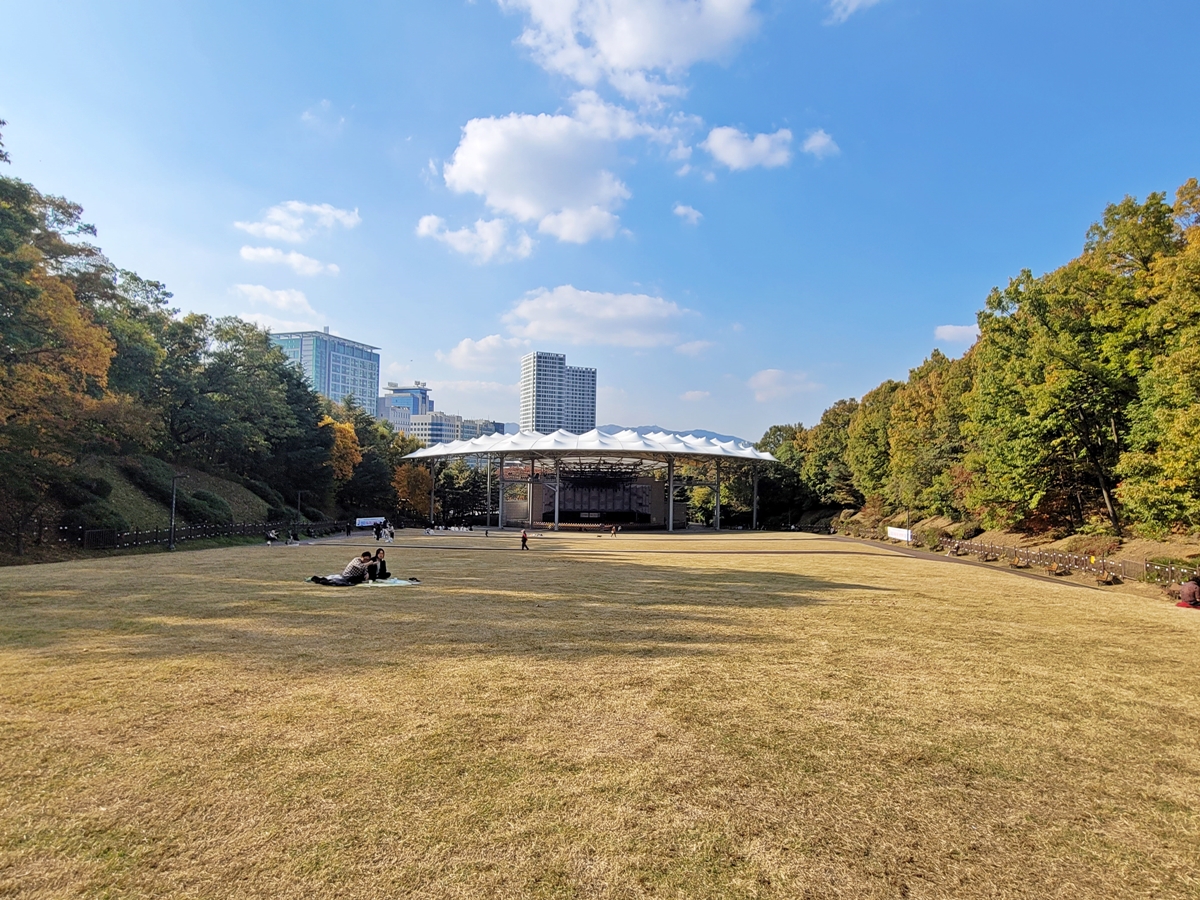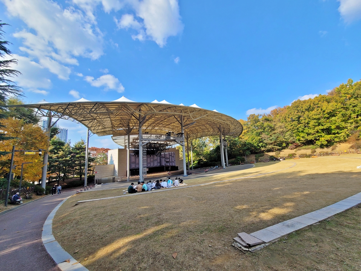 이곳은 야외음악당입니다. 각종 문화행사와 공연이 펼쳐지는 곳이죠. 약 3천 평 부지에 최대 1만여 명이 입장할 수 있습니다. 매년 5월이면 파크콘서트가 열리던 곳이죠. 코로나19로 2년 동안 중단됐다가 올해는 8~10월까지 파크콘서트가 열렸습니다. 가을 색으로 물든 지금은 잔디밭이 시민 휴식처로 변했습니다.