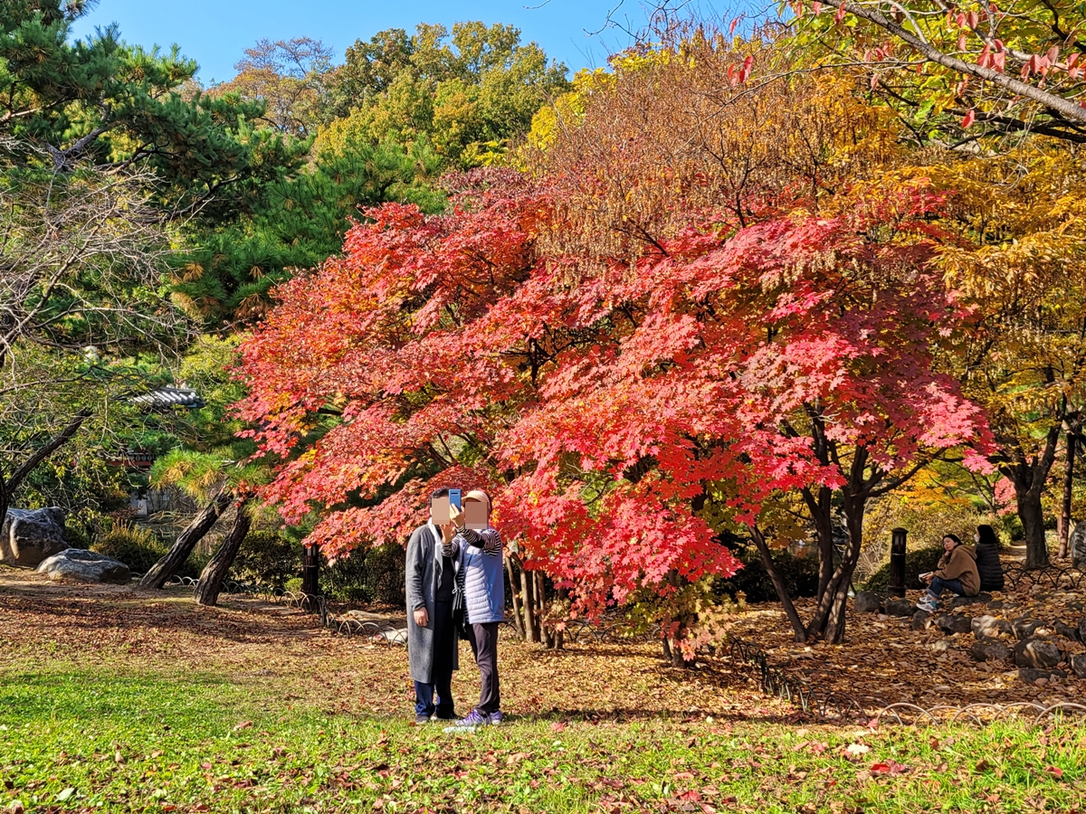 그렇죠. 지금 아니면 내년 가을을 기약해야겠죠. 공원에 온 시민들이 빨간 단풍나무 아래서 사진을 찍으며 만추 풍경을 만끽하고 있습니다.