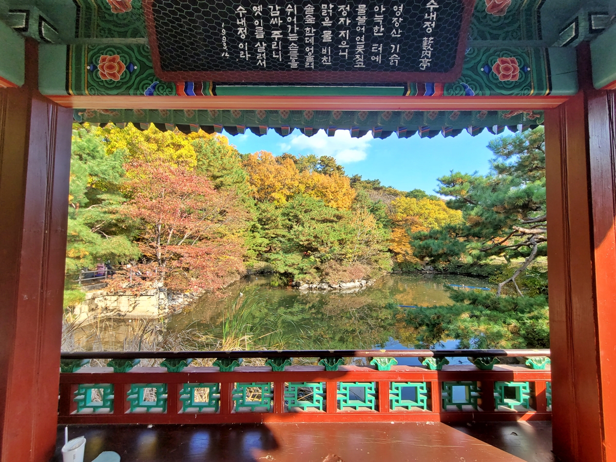 수내정은 분당중앙공원이 있는 행정구역 주소가 수내동이라 수내정이라 이름을 지었습니다. 창덕궁 애련정을 원형으로 삼아 지었습니다. 수내정에서 보는 만추 풍경은 마치 잘 찍은 사진 액자를 보는 것 같습니다.