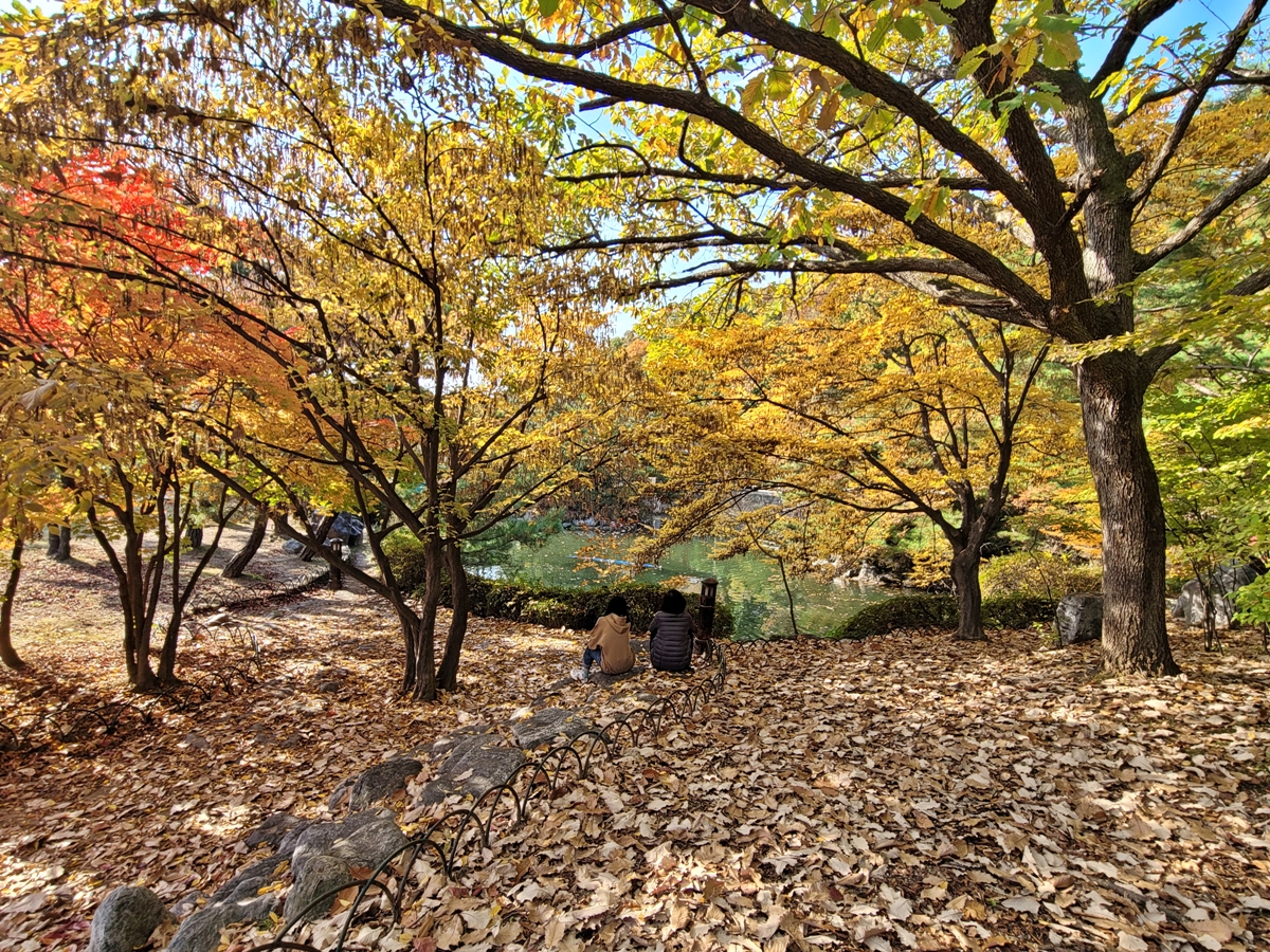 분당호 옆에서 한 부부가 만추 풍경을 보며 쉬고 있습니다. 분당중앙공원 구석구석은 가을을 느끼기 좋은 곳이 많은데요, 사실 공원 전체가 핫 스팟이라고 해도 과언이 아닙니다. 신도시로 건설된 지 30여 년이 되니 나무도 우람하게 자랐죠. 분당중앙공원의 가을이 좀 더 오래 머물렀으면 좋겠습니다.
