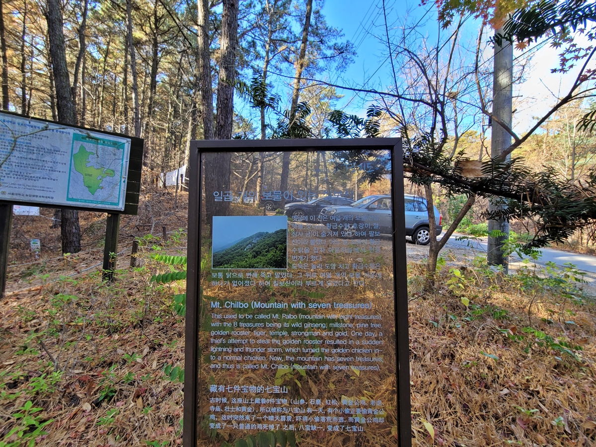 칠보산에 일곱 개의 보물이 있다는데, 그게 뭔지 아시나요? 제가 정답을 알려주겠습니다. 용화사 주차장 앞에 칠보산 유래가 적힌 안내판이 있습니다. 산삼, 맷돌, 잣나무, 황금 수탉, 호랑이, 절, 힘센 장사, 금 등 여덟 개였는데요, 하나가 왜 빠졌을까요?