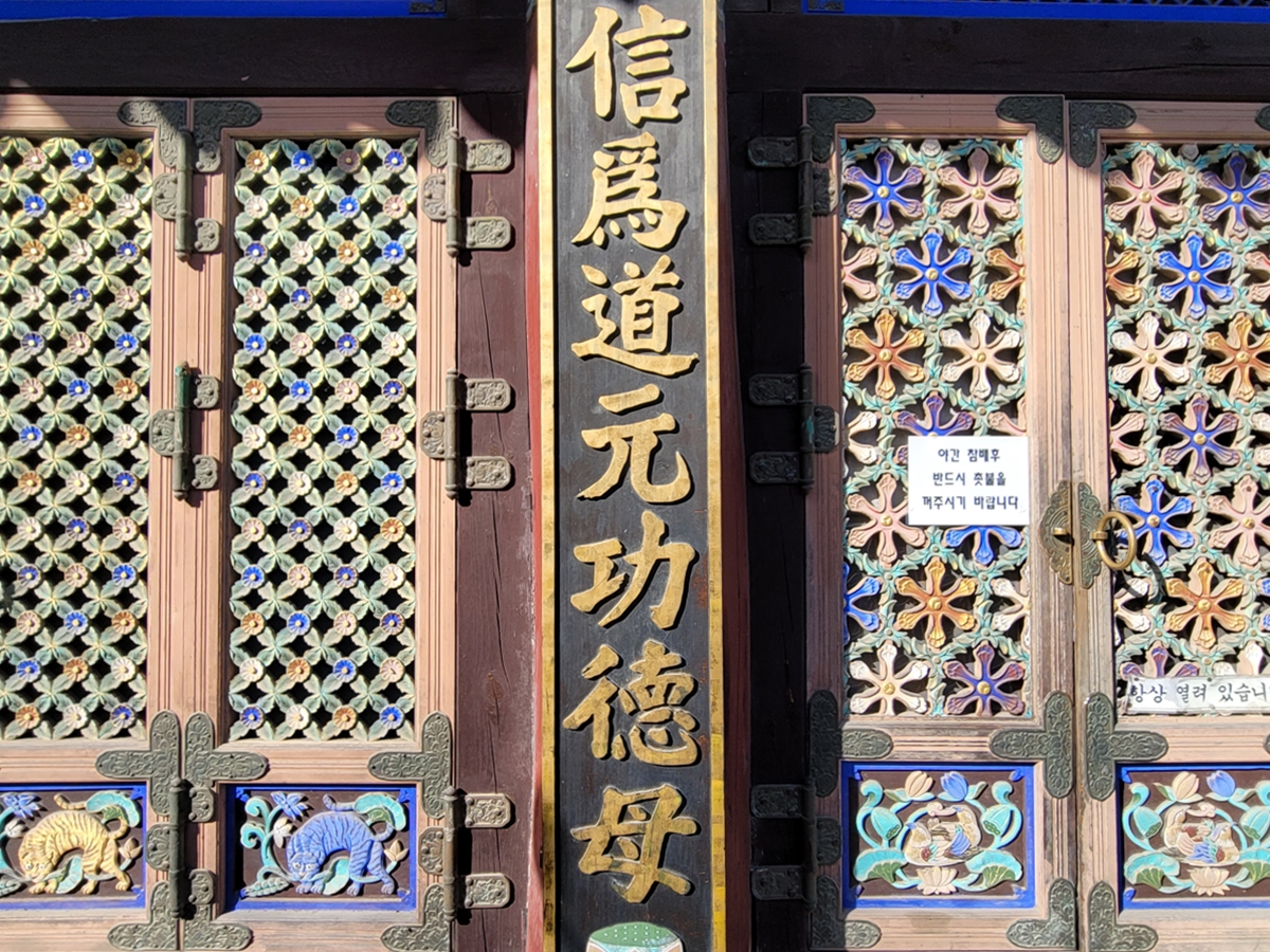 계단을 따라 대자비전으로 올라가 봅니다. 제가 갔던 날이 휴일이었는데요, 법회가 중이라 안은 들어가지 못했습니다. 문 옆마다 주련이 붙어 있습니다. 주련(柱聯)은 기둥(柱)마다 연하여 글귀를 걸었다는 뜻에서 주련이라 부릅니다. 주련 글귀의 뜻을 새겨보는 것도 의미가 있는데, 한문을 좀 알아야겠죠. 옆에 해설까지 달아주면 더 좋겠습니다.
