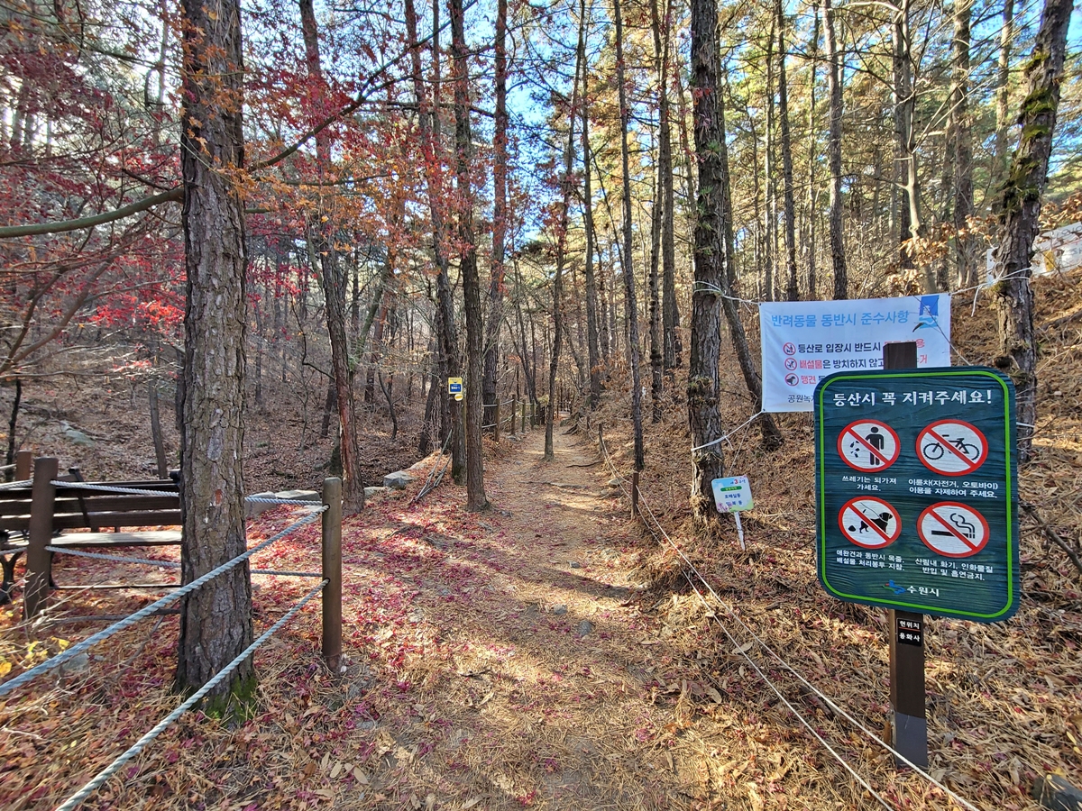 칠보산은 그리 높지 않습니다. 해발 230m니 등린이(등산 초보자)도 쉽게 오를 수 있는 산이죠. 하지만 수원에서 광교산 다음으로 높은 산이랍니다. 용화사 입구 왼편으로 칠보산을 오르는 길이 있습니다. 용화사에서 칠보산 정상까지는 1.3km입니다. 용화사를 오를 수 있는 최단 코스죠. 이 코스로 많은 시민이 칠보산을 오릅니다.