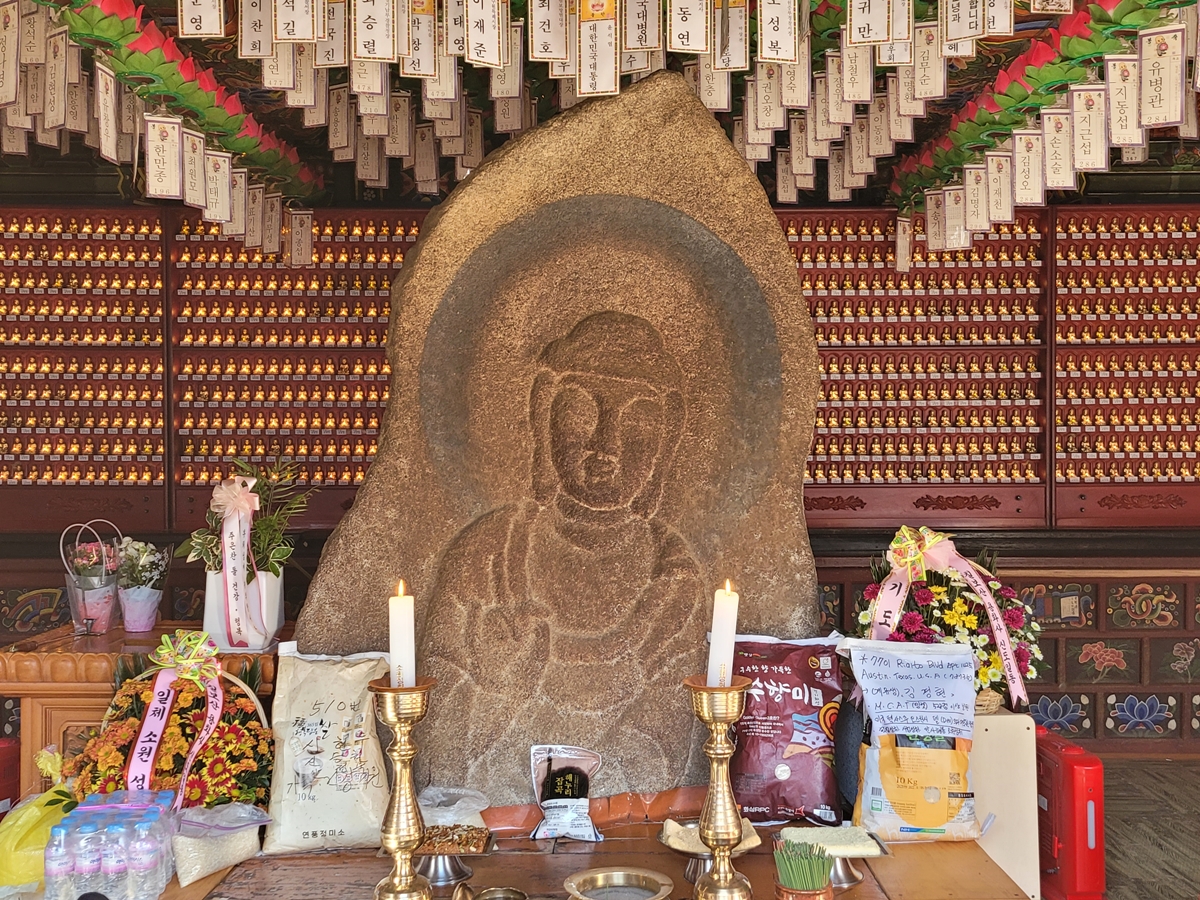 대웅전은 좁지만, 신자들이 계속 오가며 기도하고 있습니다. 이곳에 신비한 미륵불이 있거든요. 미륵불이 우측으로 약간 기울어진 모습이고요. 칠보산에 미륵불이 묻혀 있었는데요, 발견된 그 자리에 용화사를 세웠다고 하니 부처님이 이곳을 사찰 터로 지정해준 게 아닐까 싶네요. 이렇게 영험한 미륵불이니 저도 불자는 아니지만, 2023년 소망을 빌었습니다. 무슨 소원이냐고요? 가족의 건강과 행복 등 소확행을 빌었습니다.