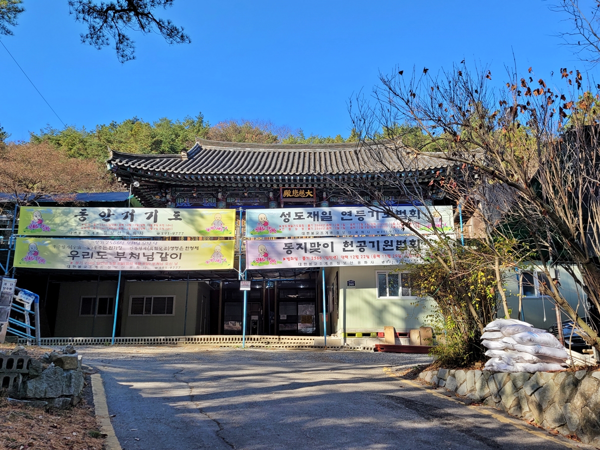 용화사는 대한불교 조계종 제2교구 본사인 용주사의 말사입니다. 말사는 본사의 관리를 받는 절을 말합니다. 주차장에서 오르다 보면 가장 먼저 보이는 전각이 대자비전(大慈悲殿)입니다. 그런데 전각 앞에 동안거기도 등 각종 현수막이 있어 전각 전체를 보기 어렵네요. 대자비전 아래는 임시 건물로 세워진 용화사 종무소가 있습니다.