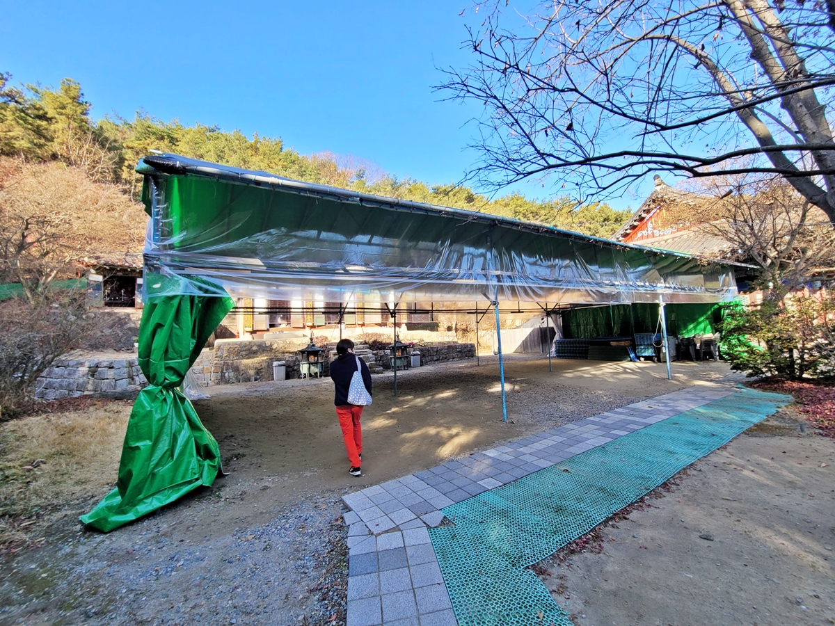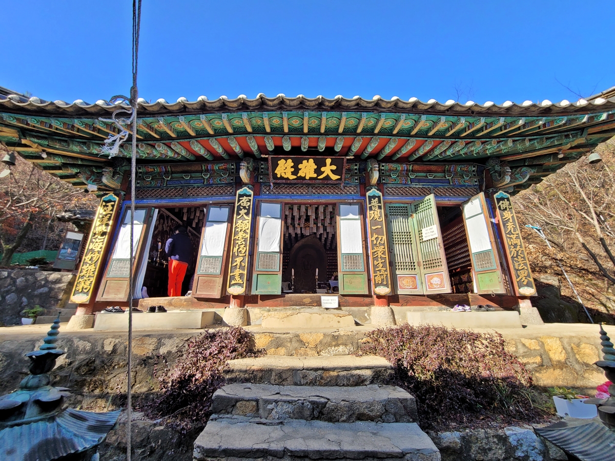 칠보산 자락 용화사는 칠보산 정기를 받아서 그런지 갈 때마다 뭔가 기를 받는 느낌입니다. 그 기를 받을 수 있는 곳이 용화사 대웅전입니다. 대웅전(大雄殿)은 모든 사찰의 정 중앙에 있죠. 대웅전 앞에 천막 같은 것이 설치되어 있습니다. 용화사는 벌써 겨울 채비를 마쳤네요. 천막 앞에서 광각으로 대웅전 모습을 간신히 카메라에 담았습니다.