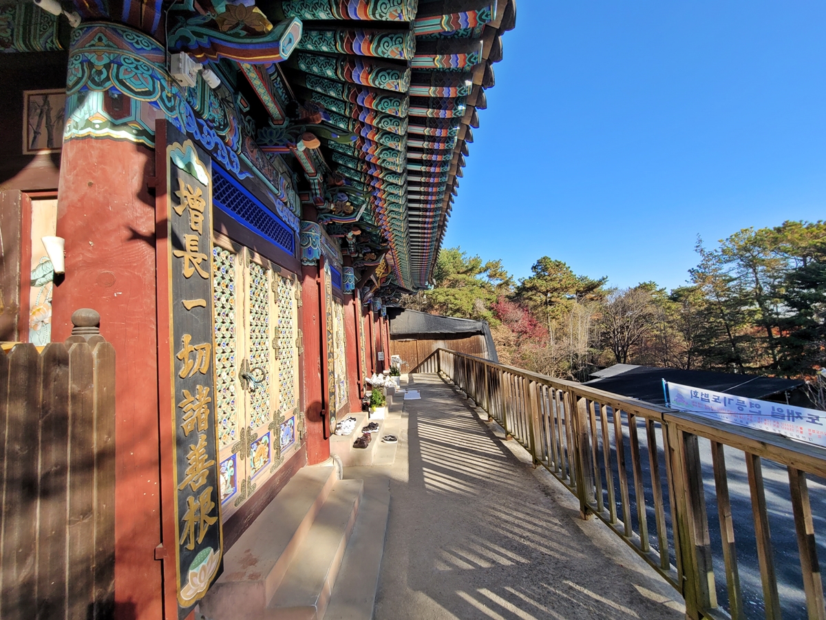 대웅전 전각 옆모습입니다. 처마 밑 풍경이 겨울바람을 타고 가끔 소리를 내고 있습니다. 고즈넉한 사찰에서 풍경 소리를 듣는 것만으로도 힐링이 되죠.