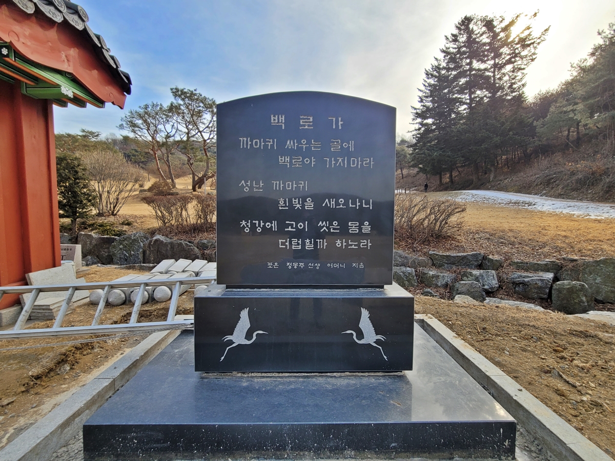 정몽주 동상 좌·우측에 검은 비석이 두 개 보입니다. 우측에는 정몽주 선생 모친이 지은 백로가입니다. 정몽주 어머니가 아들을 훈계하기 위해 지은 시조라고 하는데요, 간신이나 역신의 무리와 어울리지 않도록 아들을 훈계하며 지은 은유 시로 평가받고 있습니다.
