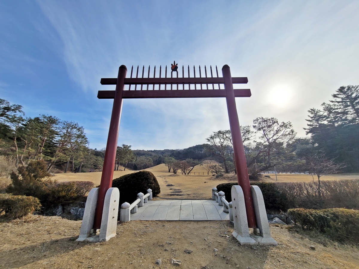 정몽주 동상 좌측에 홍살문이 있습니다. 홍살문은 서원이나 향교에 있는데요, 뭔가 신성시되는 장소를 보호하는 의미라고 합니다. 정몽주 묘역을 신성시하기 위해서 세우지 않았나 싶습니다. 홍살문 뒤로 선죽교처럼 생긴 다리가 있습니다. 선죽교는 북한 개성에 있는데요, 아직도 그 자리에 혈흔이 남아있다고 합니다.