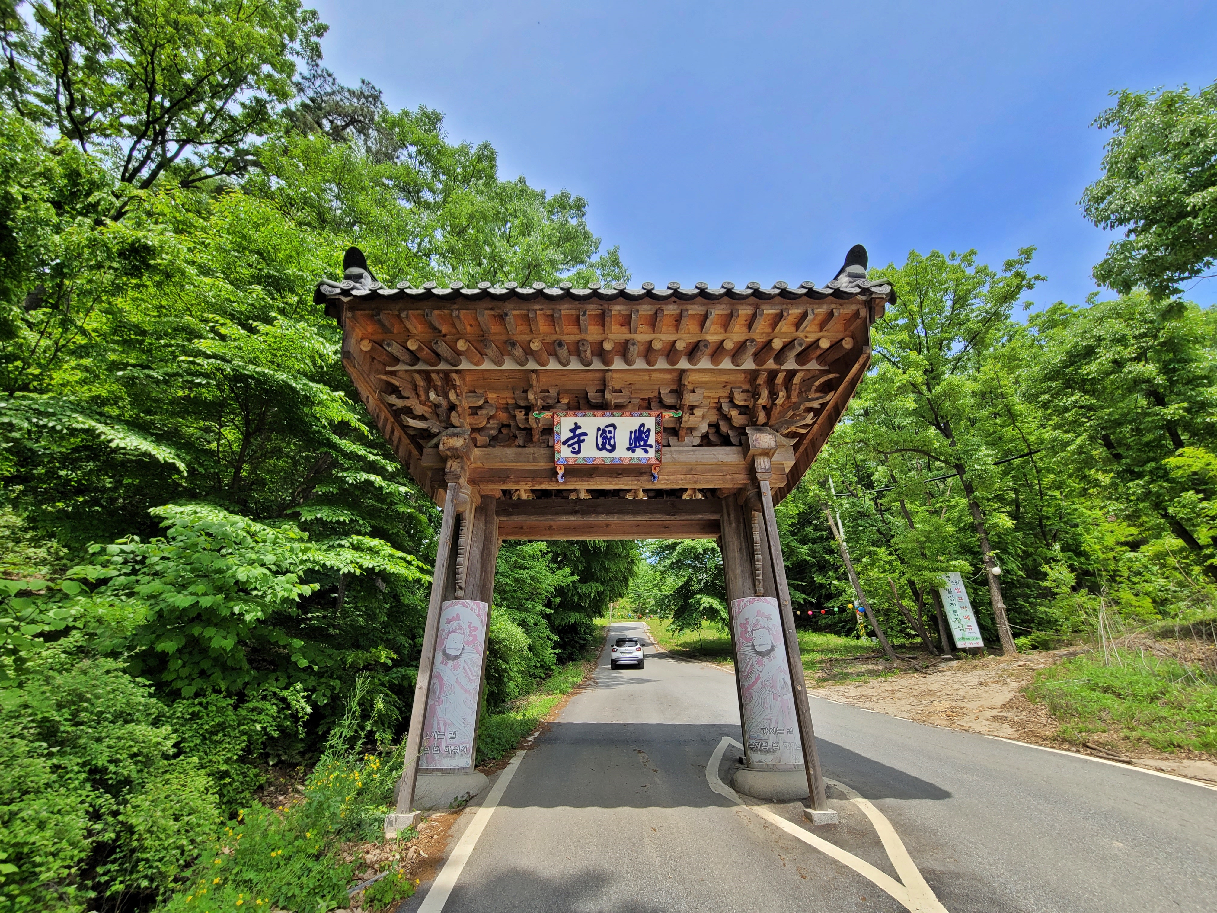 사찰로 들어가는 산문(山門)은 원래 네 개라고 합니다. 그중 일주문(一柱門)은 첫 번째 문입니다. 일주문에 한문으로 ‘興國寺(흥국사)’라고 쓰여 있습니다. 불교 신자가 아니라서 잘 모르지만, 일주문을 들어설 때마다 뭔가 세속의 번뇌를 벗어던지는 기분이 듭니다. 일주문 옆으로 난 도로를 따라 차를 타고 들어갔습니다.