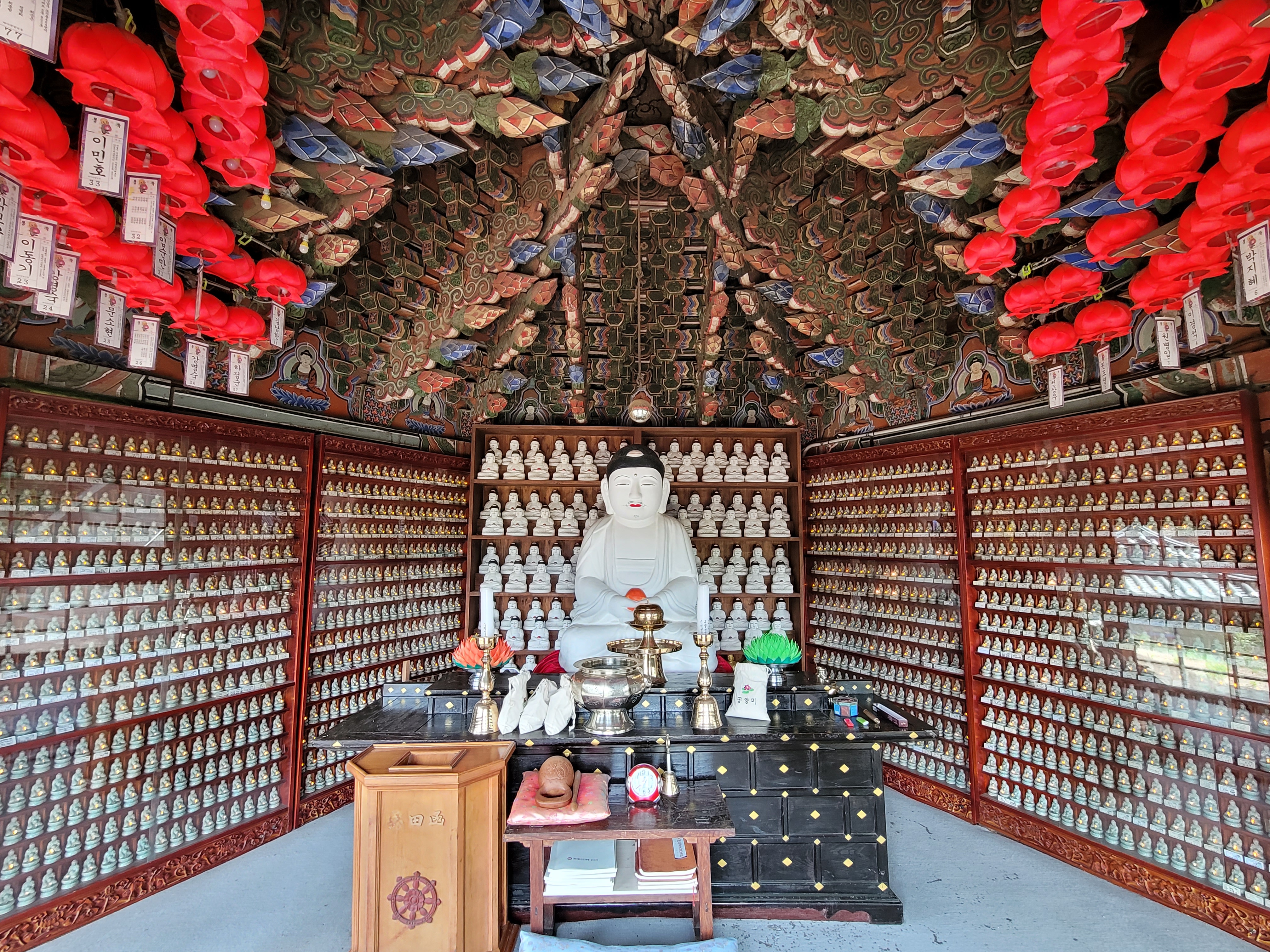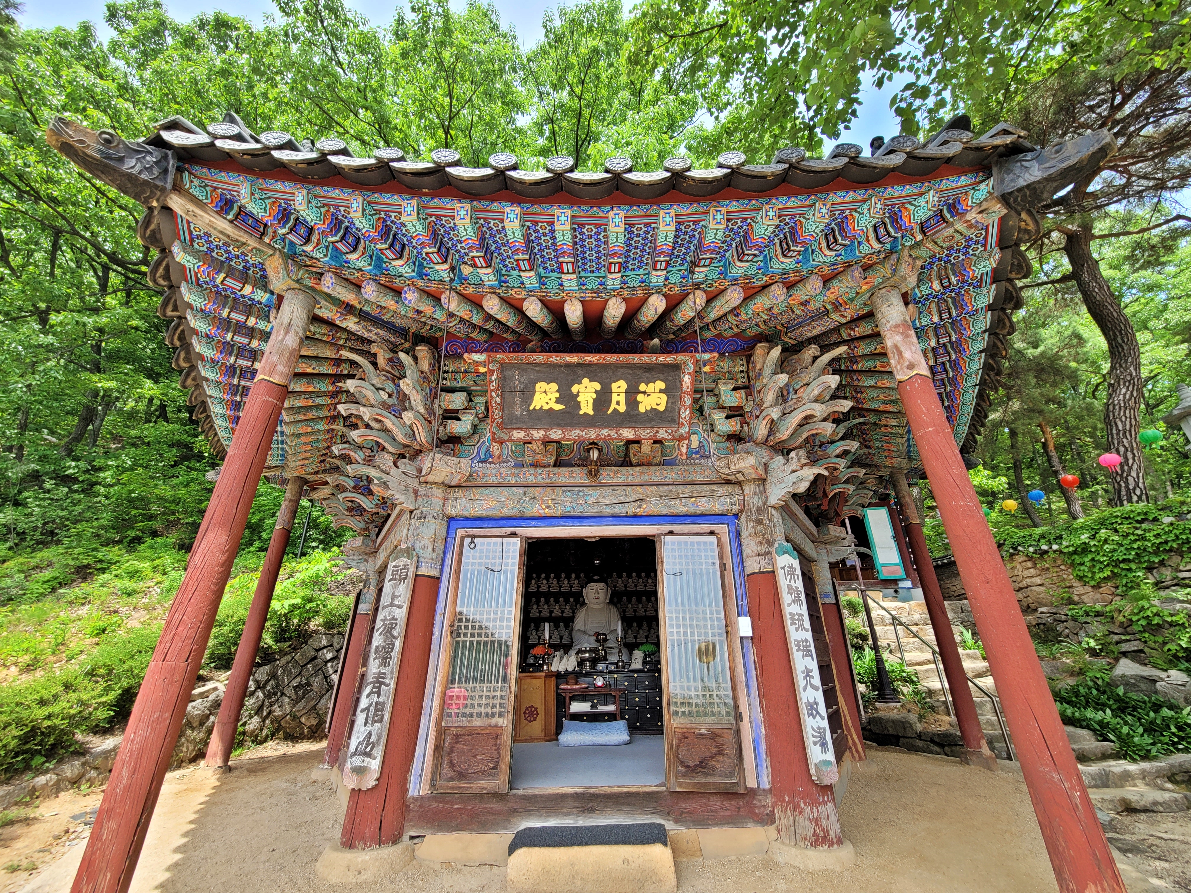 독성각 옆에 만월보전(滿月寶殿)이 있습니다. 사찰 건물로는 드물게 육각형입니다. 여기 있는 불상은 약사불좌상입니다. 보통 불교 전각을 보면 부처님 모습이 금빛으로 되어 있잖아요. 여기는 흰색이라 조금 특이합니다. 분칠을 한 건가요? 제가 보니 부처님이 화장을 한 것처럼 보였습니다.