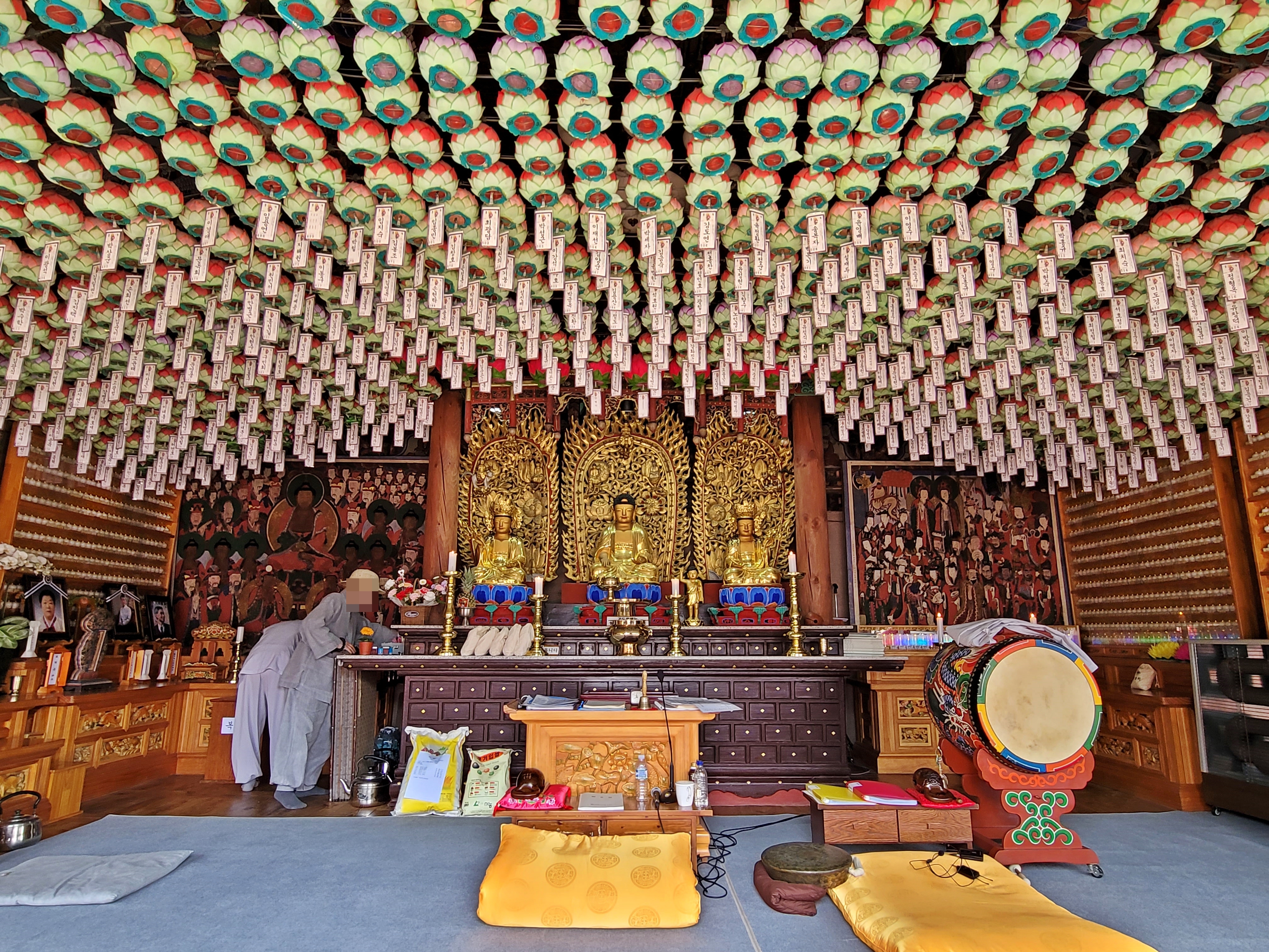 영산전 우측에 대웅보전(경기도 문화재자료 제56호)이 있습니다. 흥국사에서 가장 중요한 전각이라 정 가운데 있습니다. 문이 열려 있어 안을 보니 스님 두 분이 뭔가 준비를 하고 있습니다. 대웅보전 천정에도 많은 불자의 이름과 소원이 적힌 연등이 걸려있습니다.