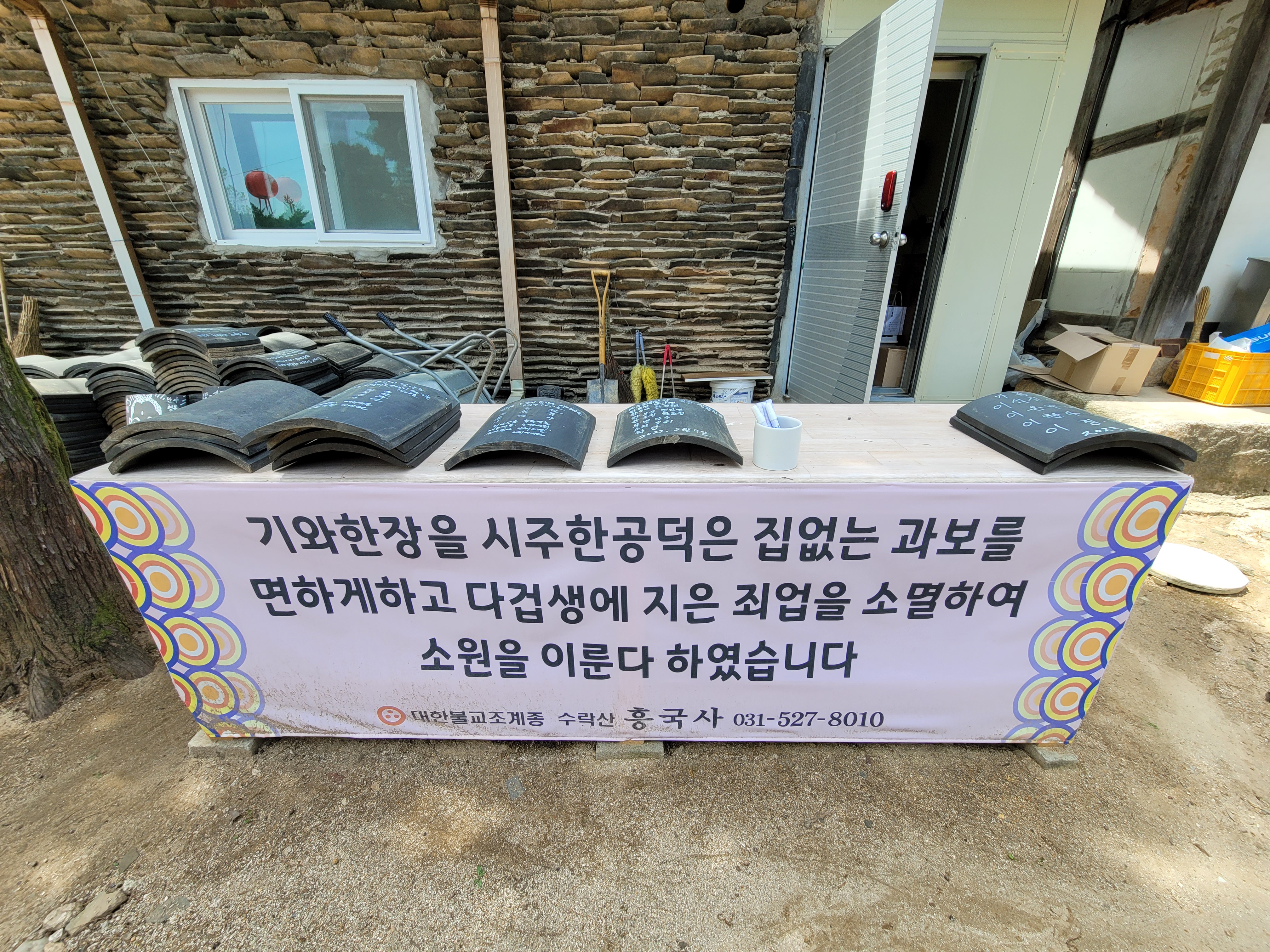 대방 옆에 종무소와 기와 시주를 하는 곳이 있습니다. “기와 한 장을 시주한 공덕은 집 없는 과보를 면하게 하고, 다겁생에 지은 죄업을 소명하여 소원을 이룬다.”는 글이 쓰여 있습니다. 기와 불사 한 장에 1만 원인데요, 많은 불자가 기와 시주를 하였습니다.