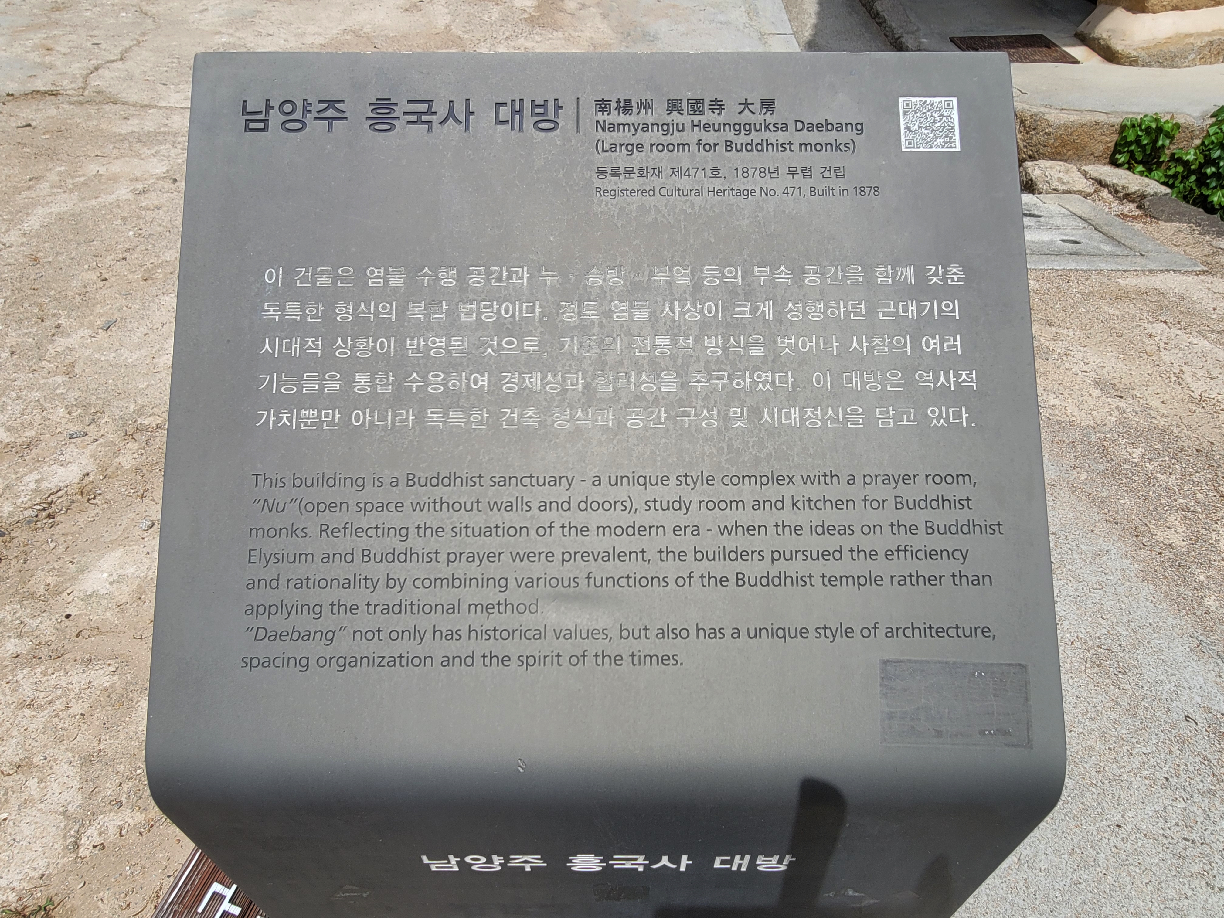 안내판을 읽어보니 첫 번째 건물은 흥국사 대방이라고 적혀 있습니다. 이 건물은 염불 수행 공간과 누, 승방, 부엌 등의 부속 공간을 함께 갖춘 독특한 형식의 복합 법당입니다. 정토 염불 사상이 크게 성행하던 근대기의 시대적 상황이 반영된 것으로, 기존의 전통적 방식을 벗어나 사찰의 여러 기능을 통합 수용하여 경제성과 합리성을 추구하였다고 합니다.