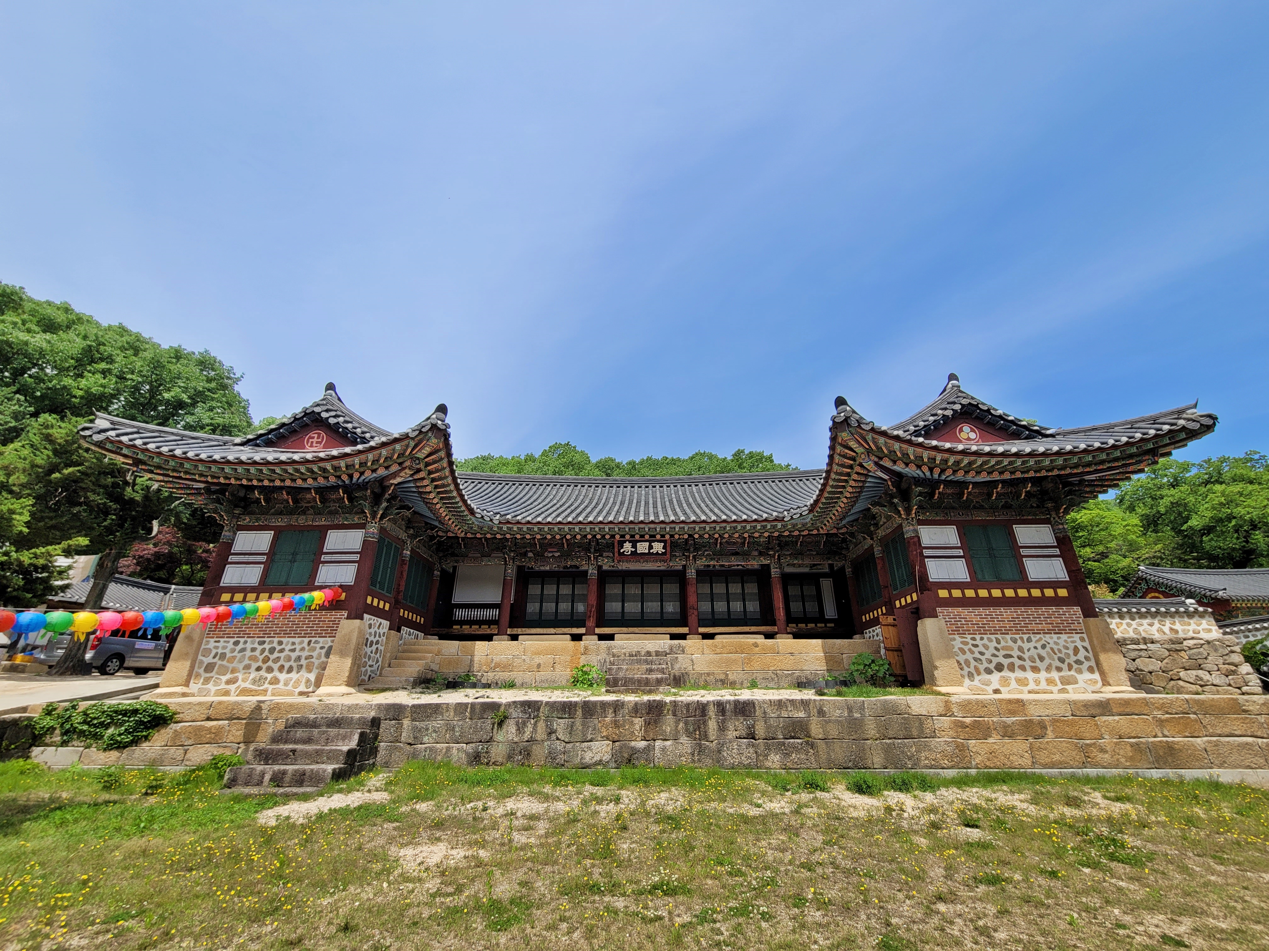 흥국사 경내로 들어서니 현판이 걸린 웅장한 건물이 맞아줍니다. 그런데 다른 사찰과 달리 뭔가 궁궐에 있는 집을 보는 듯한 느낌을 줍니다. 전각 앞에는 흥국사 이름이 적힌 연등이 걸려있고, 바람에 조금씩 흔들립니다.