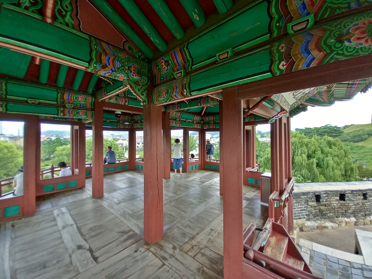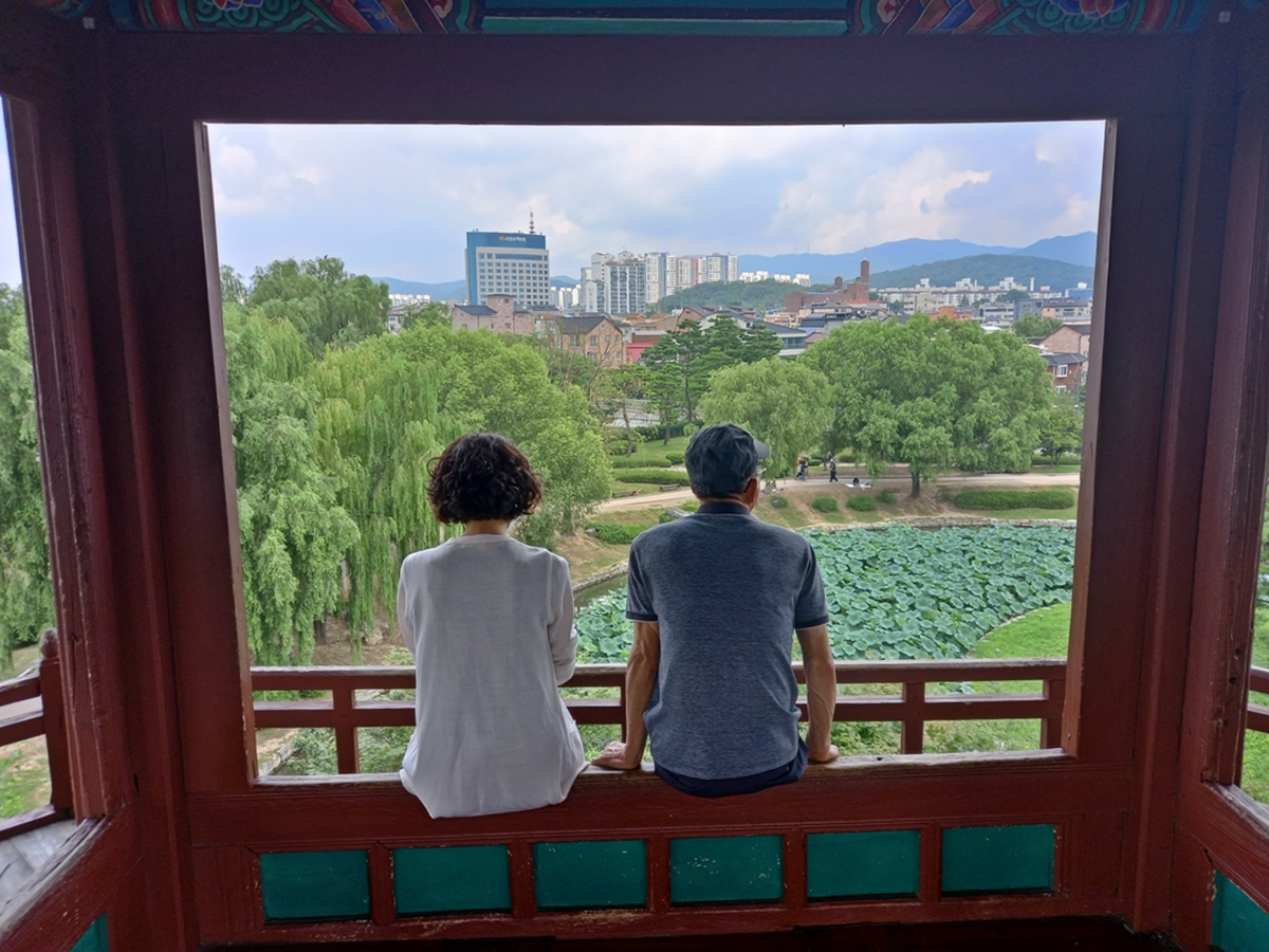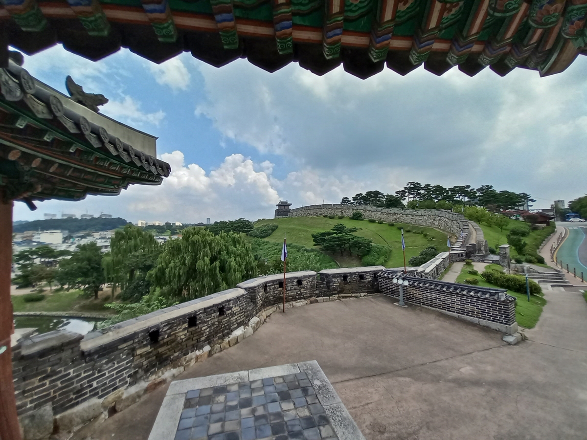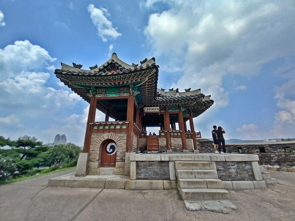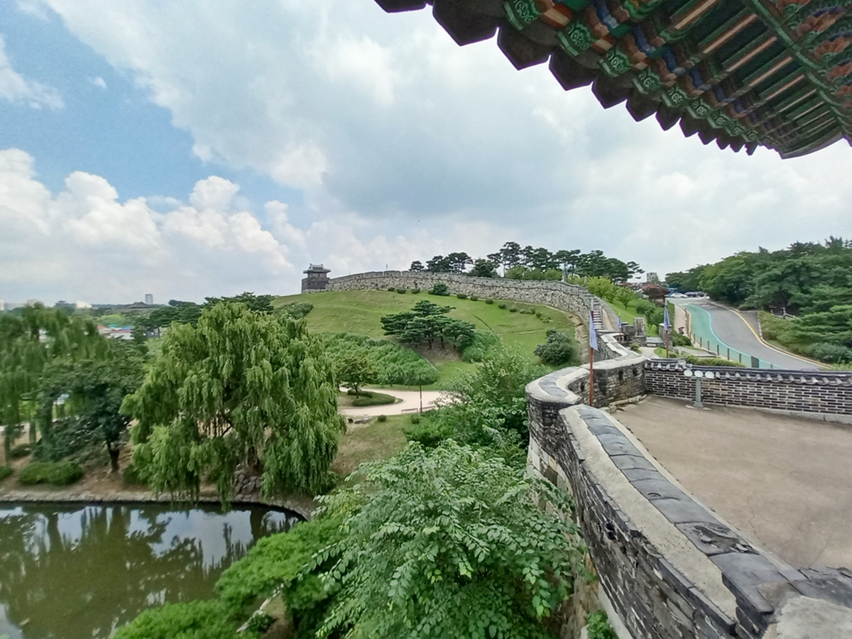 어느 중년 부부가 방화수류정에서 용연을 바라보며 쉬고 있습니다. 이런 사진 SNS에 올릴 각이죠. 방화수류정은 수원만의 자랑이 아니라 대한민국의 자랑입니다. 2012년 CNN에서 ‘한국에서 가봐야 할 50선 관광지’에 선정된 곳이기도 합니다. 또한 수원을 대표하는 여덟 곳(수원 8경) 중 한 곳입니다. 더 이상 말이 필요 없죠.