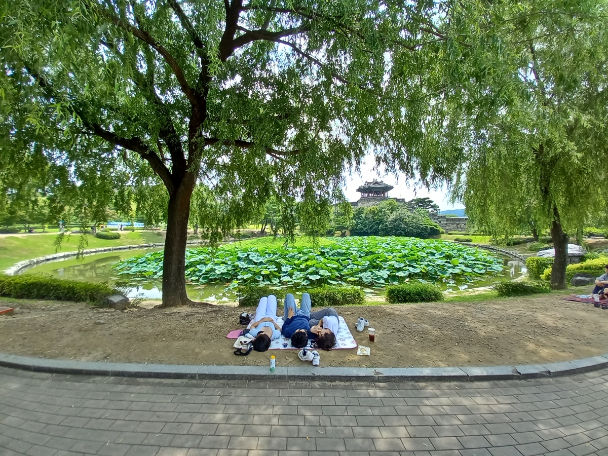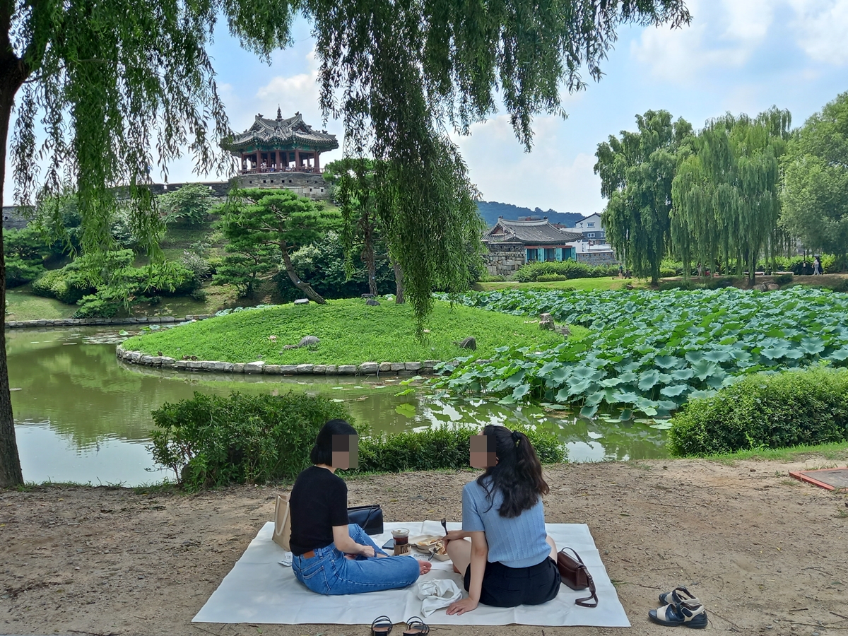 저는 평일에 갔는데요, 그래도 사람이 많네요. 방화수류정 버드나무 아래 돗자리를 깔고 앉아 초가을 햇살을 받으며 용연을 바라보며 물멍하기도 좋고요. 남녀, 가족, 친구와 함께 와서 조잘조잘 얘기하며 일상에 지친 심신을 달래는 것은 어떨까요?