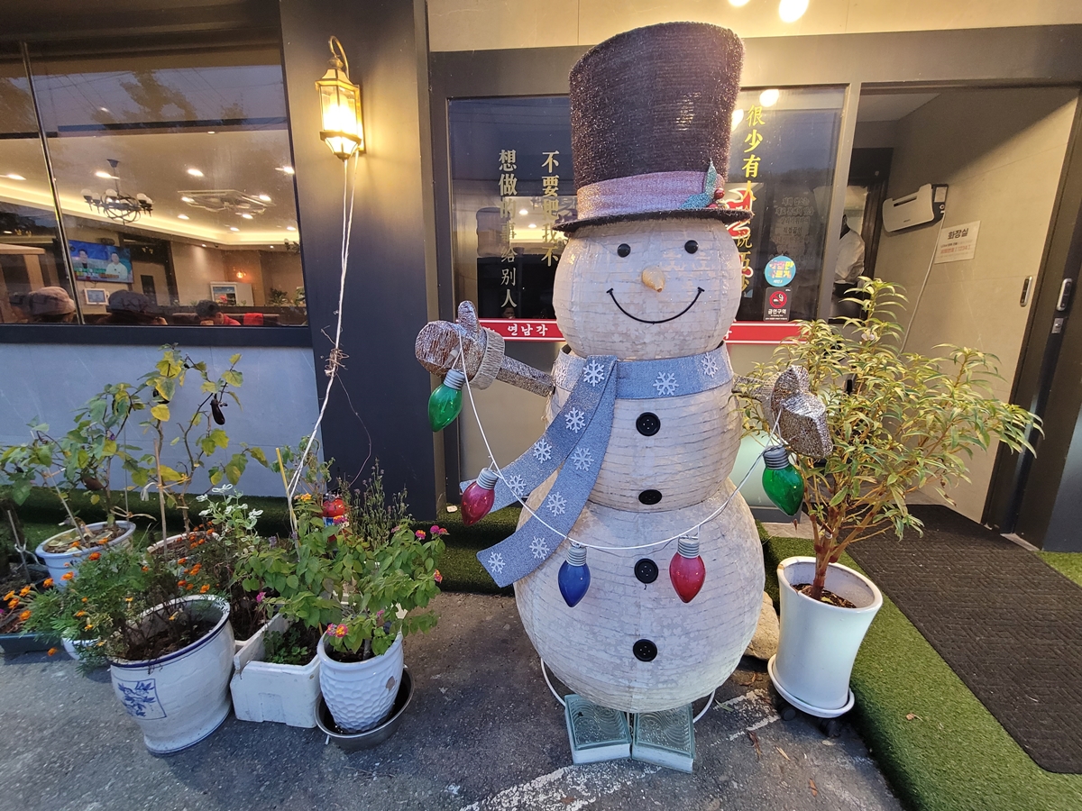 식사를 마치고 나오니 어두워졌습니다. 식당 앞에 눈사람 인형이 반겨주는데요, 저녁때라 그런지 손님이 많이 찾아옵니다. 연남각은 용인시 중국요리 집 중에서 깔끔한 인테리어와 불 향이 가득한 철판 해물짜장, 해물짬뽕이 맛있는 집입니다. 오늘 뭐 먹을까? 고민이 될 때 용인시 처인구 모현읍에 있는 연남각 중화요리 어떨까요?