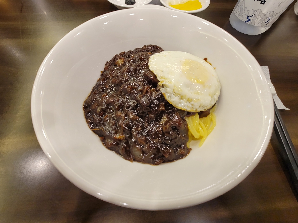 탕수육을 다 먹을 때쯤 짜장면과 짬뽕이 나왔습니다. 짜장면은 위에 달걀부침이 놓여 있고요, 그 아래 짜장 소스가 덮여 있습니다.