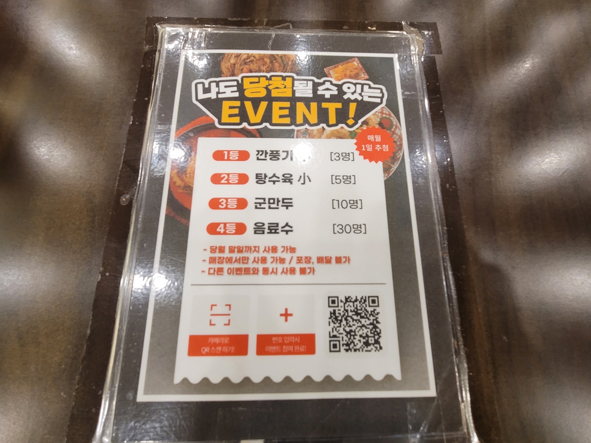 할인행사 외에도 이벤트도 있습니다. 식사 후 QR코드로 이벤트에 참여하면 매월 한차례 추첨을 통해 깐풍기, 탕수육, 군만두 등을 드실 수 있습니다.